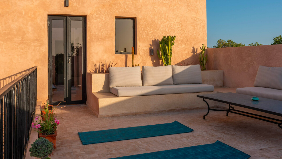 La grande terrasse permet de pratiquer le yoga en toute tranquillité, face à un paysage apaisant.