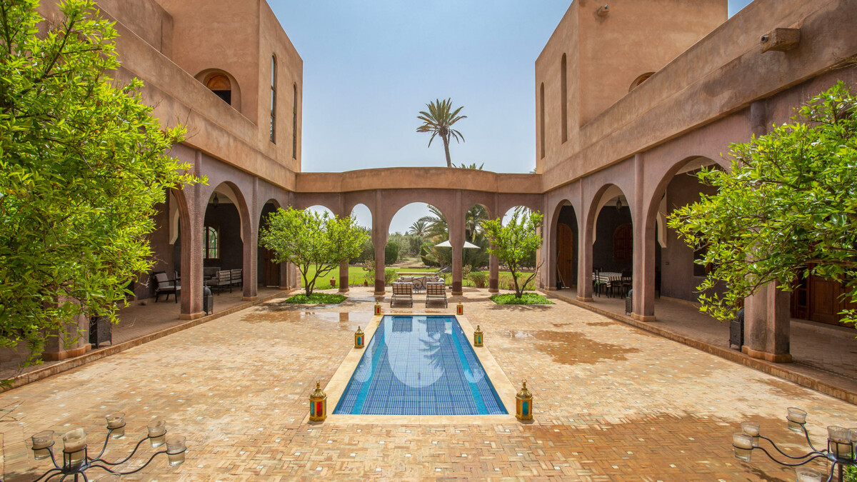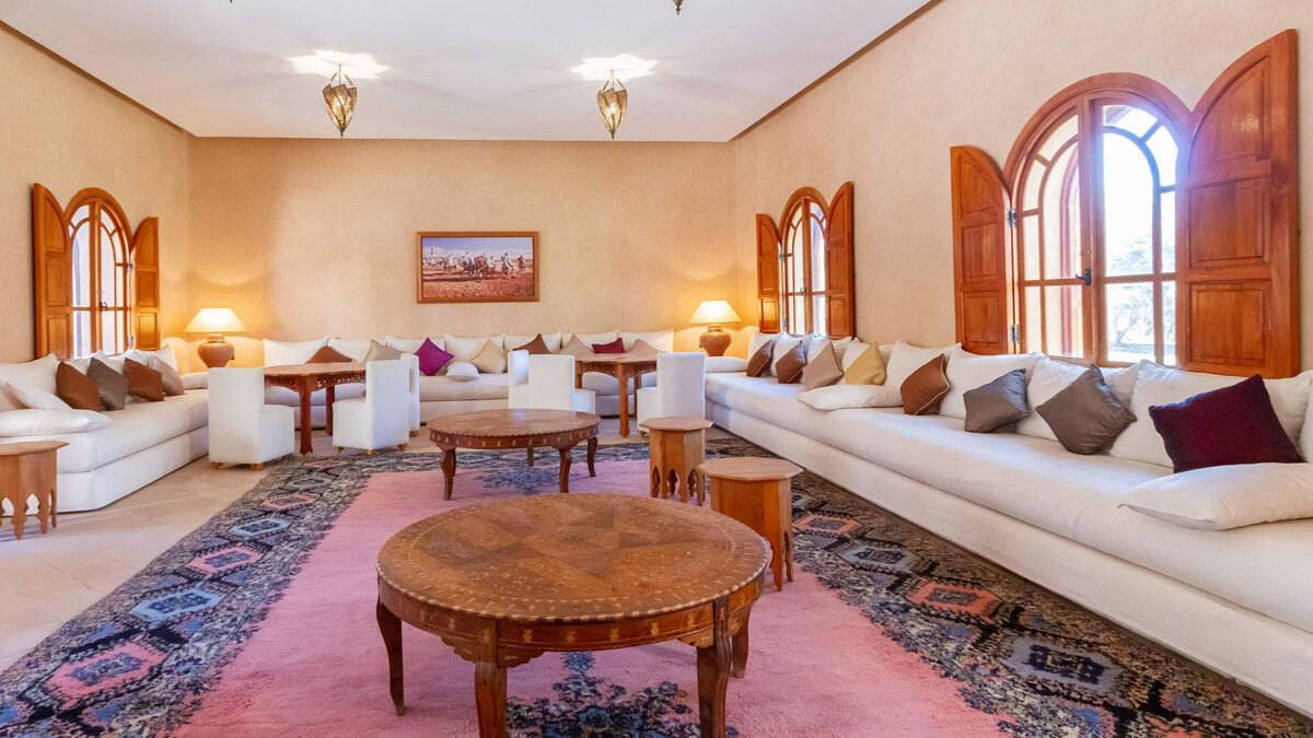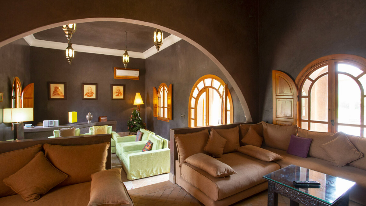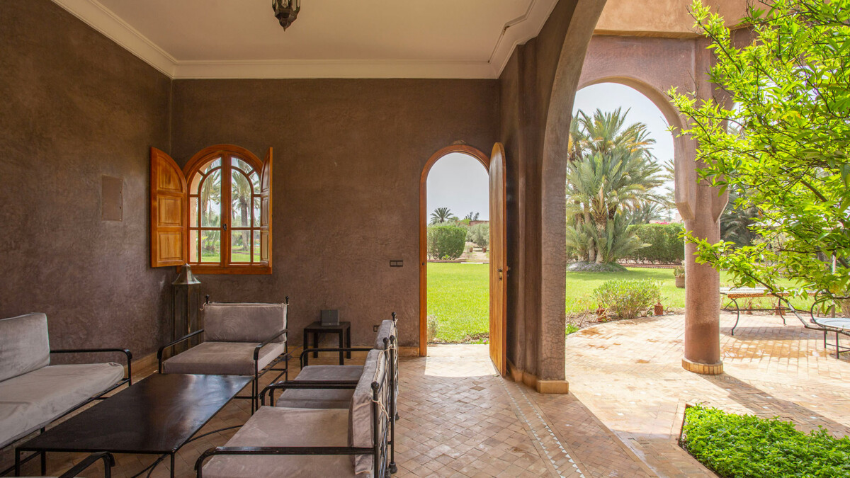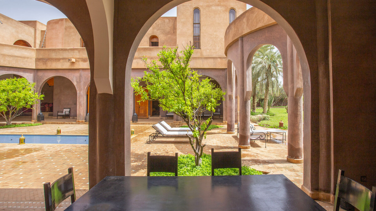 La villa s’organise autour d’un large patio central ouvert sur le jardin et agrémenté d’un bassin mauresque. Du patio on accède au grand salon marocain, au salon européen et à la salle à manger. Des espaces de détente ont été aménagés autour du patio pour déjeuner ou simplement se reposer à l’ombre de la galerie.