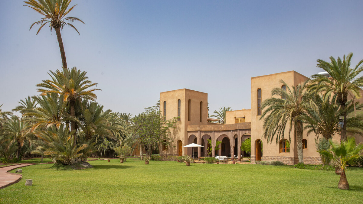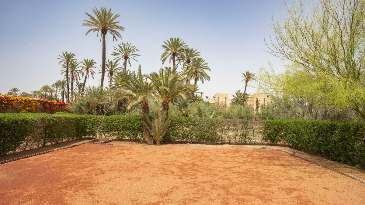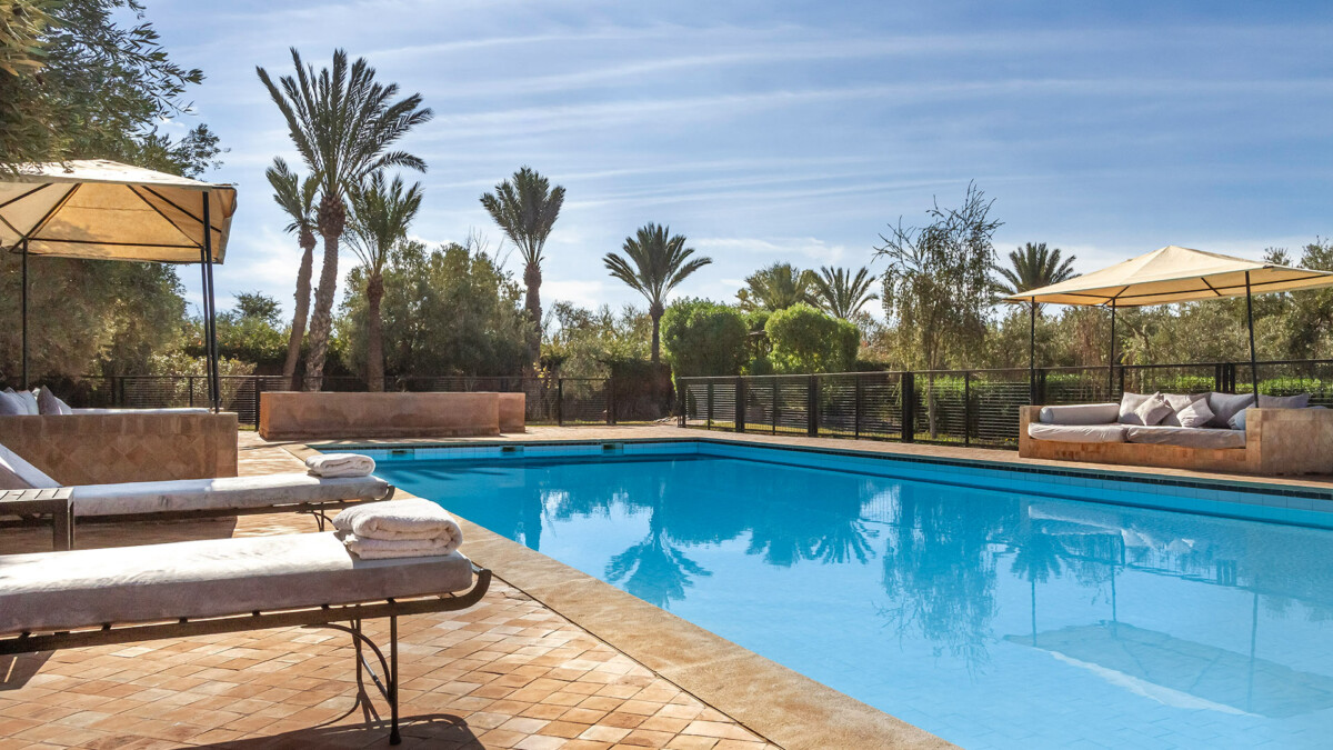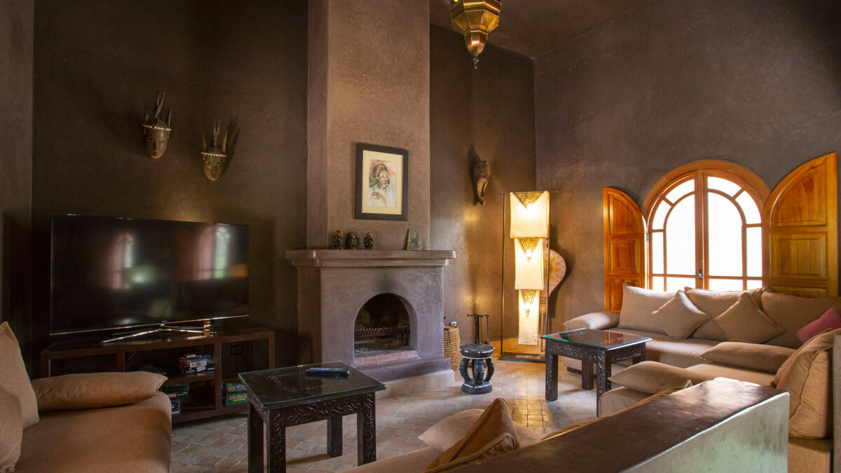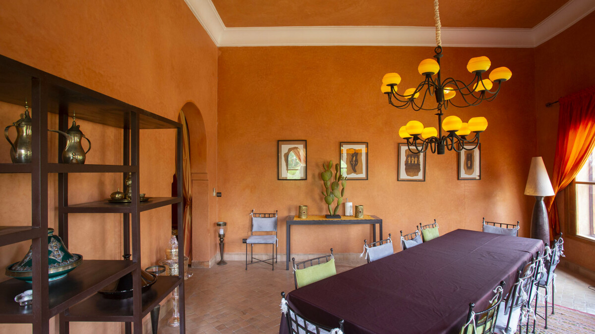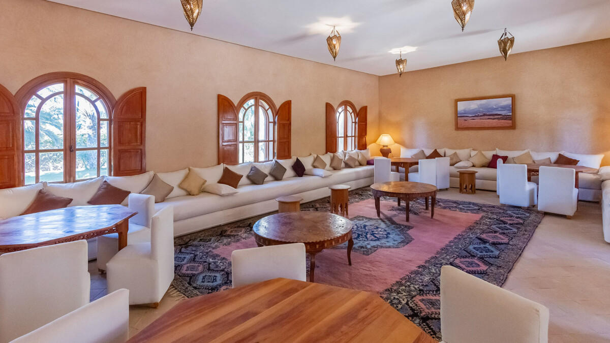 La villa s’organise autour d’un large patio central ouvert sur le jardin et agrémenté d’un bassin mauresque. Du patio on accède au grand salon marocain, au salon européen et à la salle à manger. Des espaces de détente ont été aménagés autour du patio pour déjeuner ou simplement se reposer à l’ombre de la galerie.