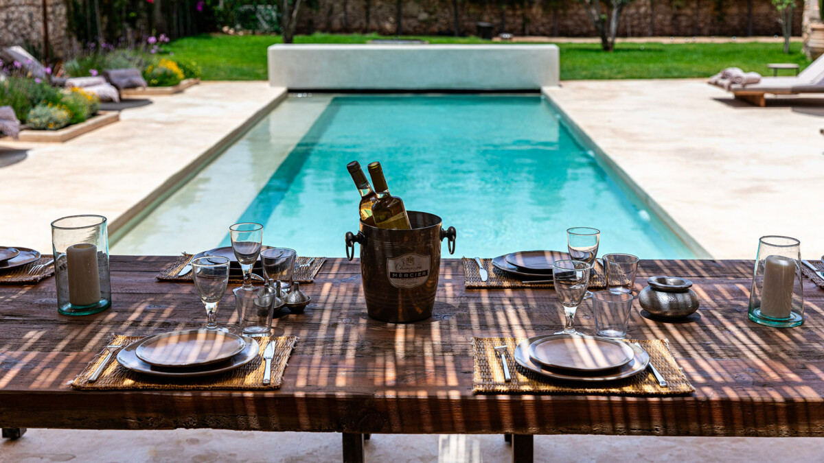 La vie s’organise autour d’une majestueuse terrasse sous pergola de 80 m², véritable pièce à vivre ouverte : grande table pour 10 à 12 personnes, salon d’extérieur, barbecue et plancha. La piscine (9 x 4m – Profondeur : 0.9 à 1.5m), qui peut être chauffée sur demande et moyennant supplément, accueille des chaises longues, idéales pour se détendre au soleil. Le jardin, partiellement gazonné, comprend un terrain de pétanque et offre une ambiance paisible. Le toit-terrasse, accessible depuis la suite à l’étage, offre le plus beau panorama du domaine.