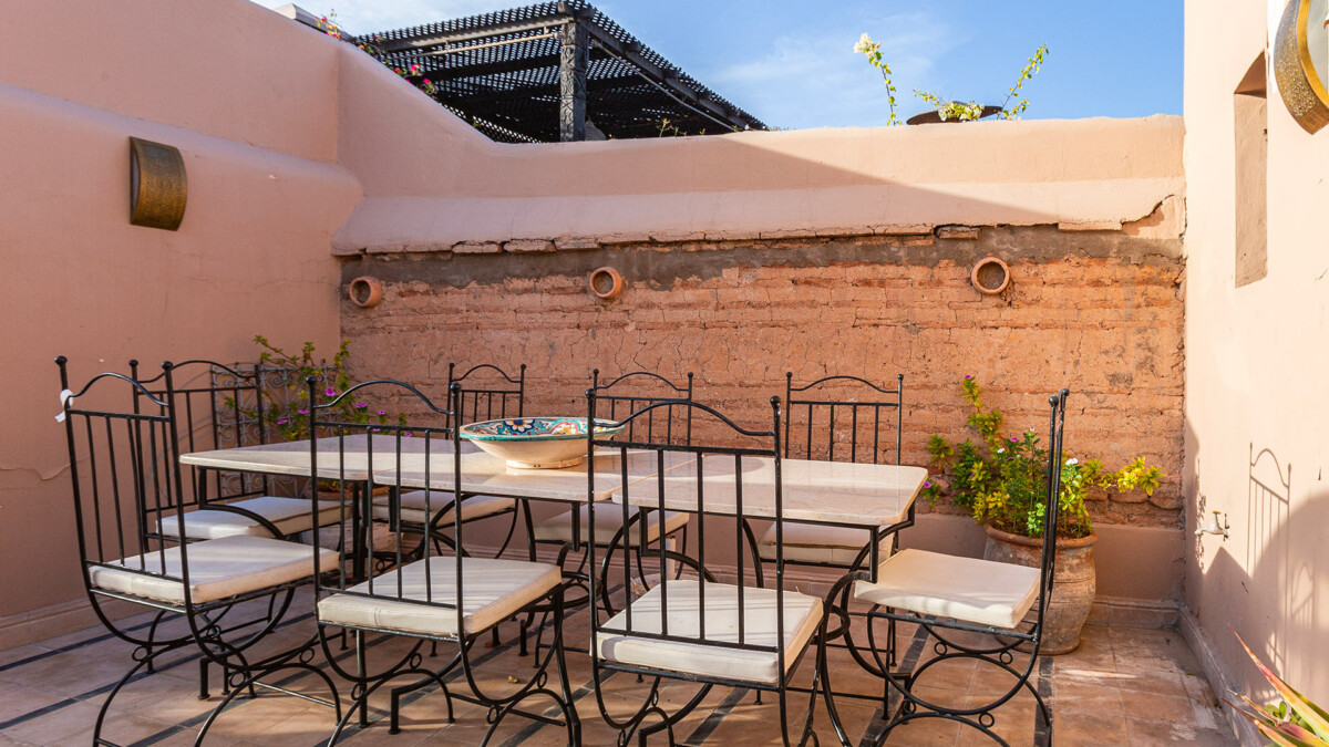 Le riad bénéficie d’une terrasse aménagée en rooftop, idéale pour se détendre sous le soleil de Marrakech.