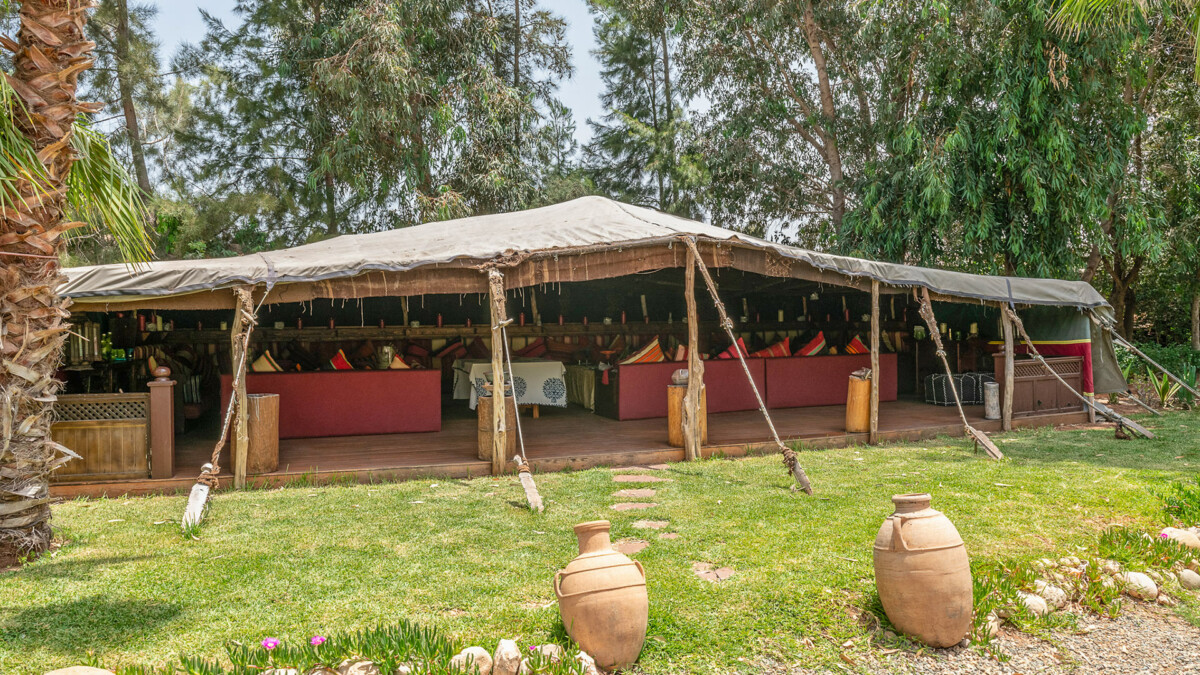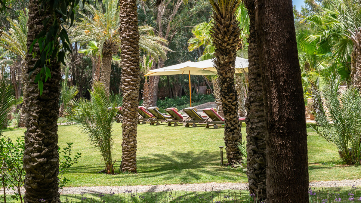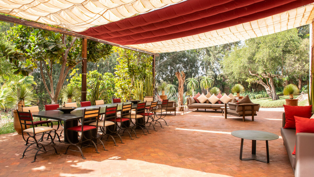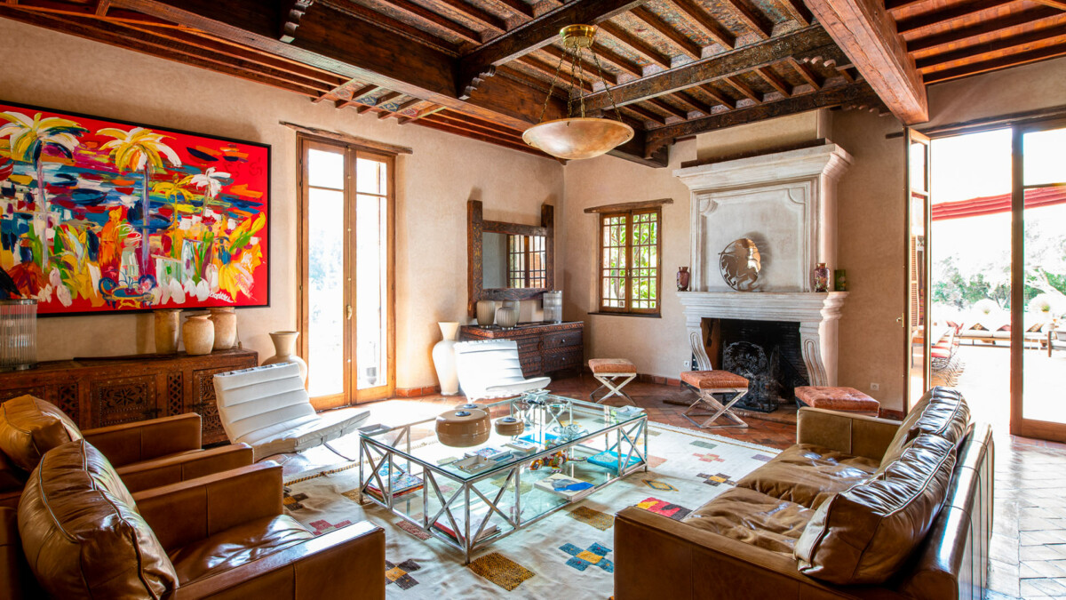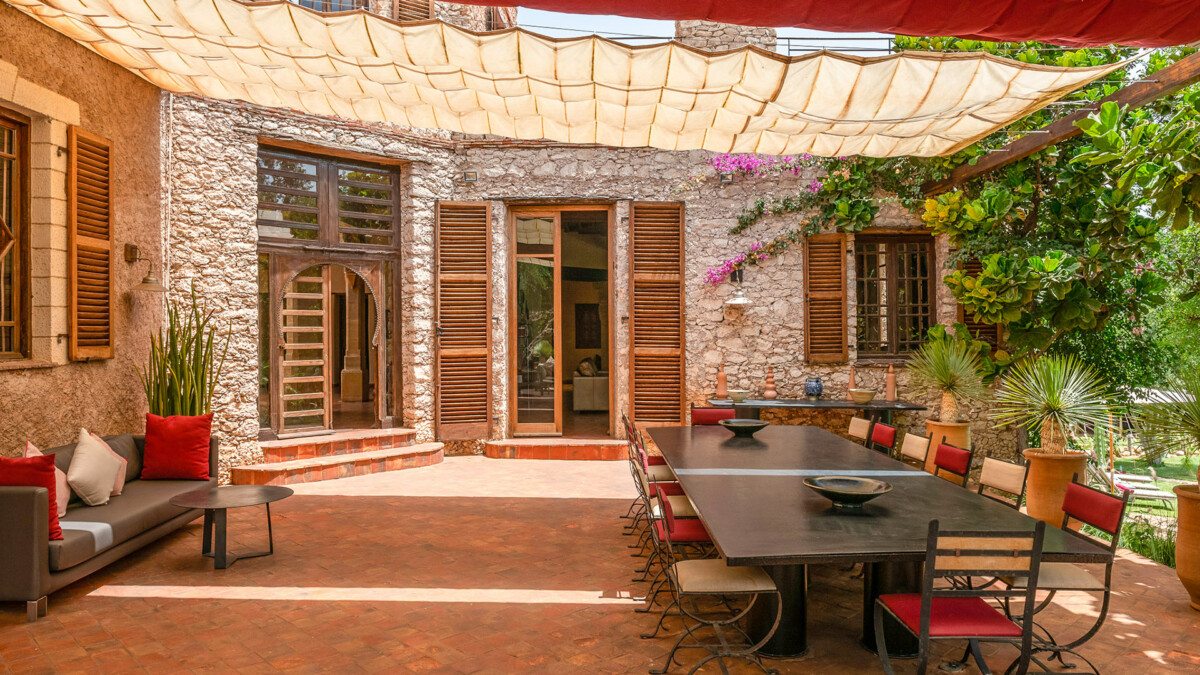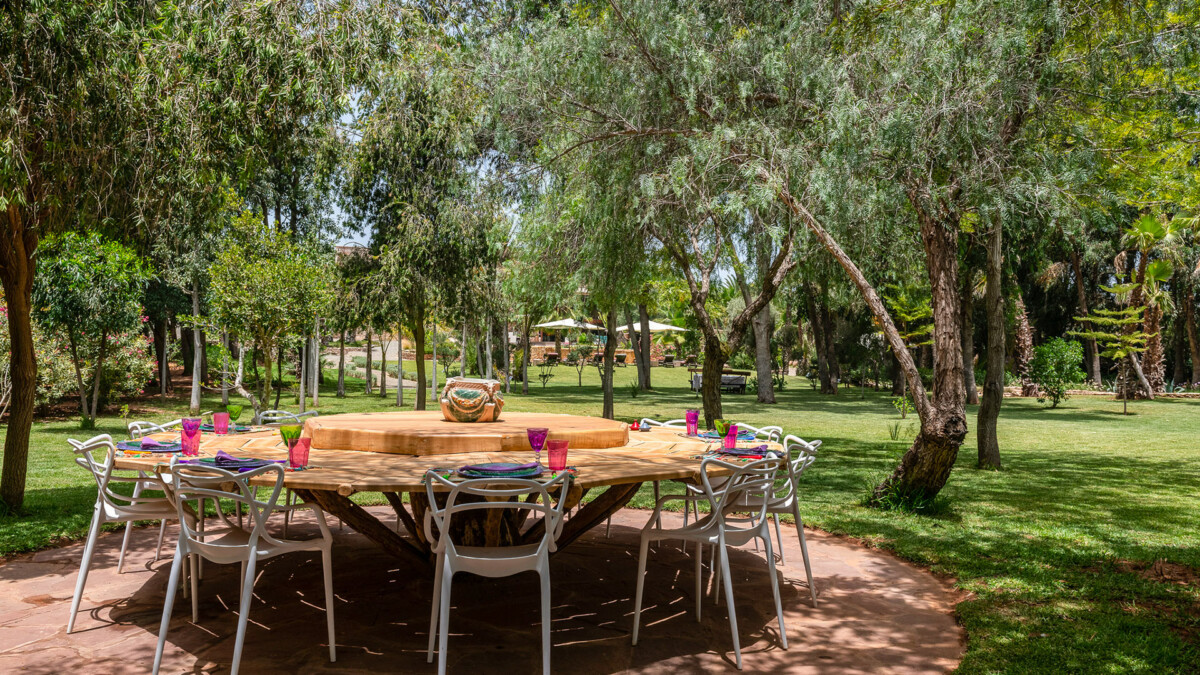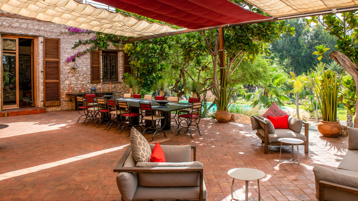 La beauté de la villa se poursuit à l’extérieur avec une piscine à cascade, un bassin chauffable, des espaces lounge et repas ombragés, une tente berbère traditionnelle et une multitude d’options de loisirs, y compris un terrain de tennis privé éclairé, un espace pétanque et une table de ping-pong. Le domaine privé abrite également un parc verdoyant de plus d’un hectare, dominé par des palmiers et des eucalyptus, ce qui fait de la propriété un véritable Eden marocain.