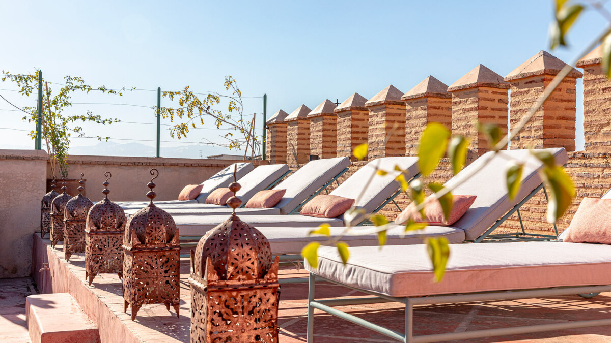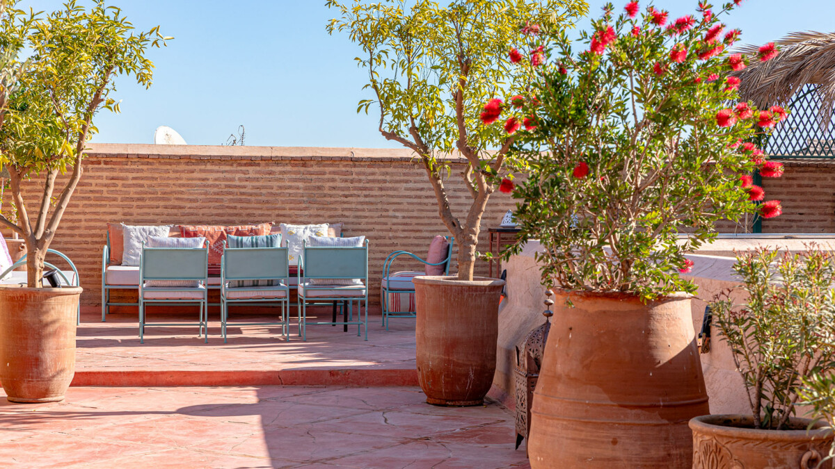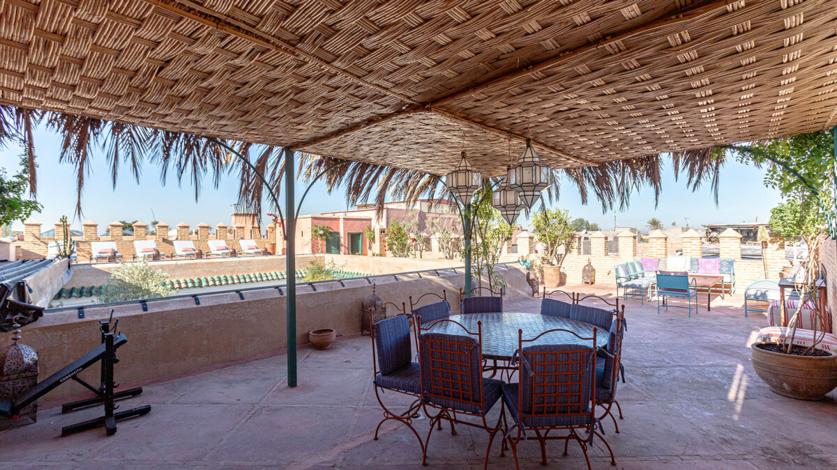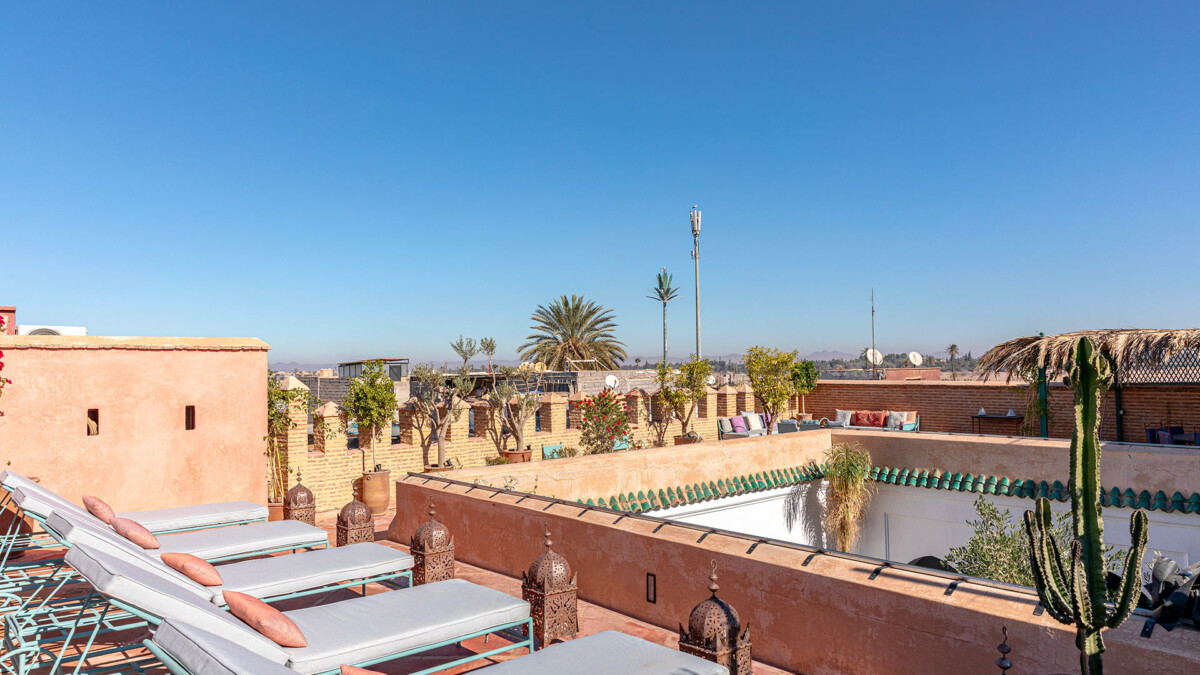 La terrasse sur le toit du riad, s’étend sur 200 mètres carrés. Cet espace en plein air est aménagé avec six transats pour profiter du soleil et offre un vaste salon extérieur. C’est l’endroit idéal pour siroter un thé à la menthe. Que vous souhaitiez vous détendre après une journée bien remplie ou savourer un repas sous les étoiles, cette terrasse est votre havre de paix à Marrakech.