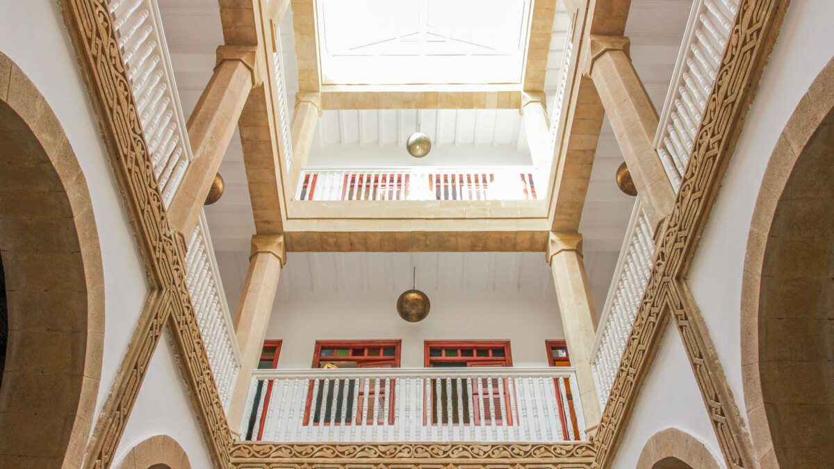 Le patio est très lumineux jusqu’au rez de chaussée. Une grande verrière le chapeaute et laisse entrer le soleil généreux d’Essaouira.