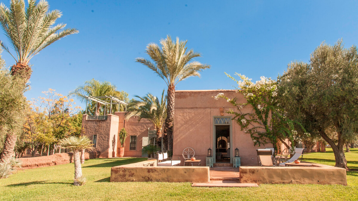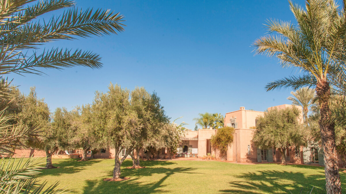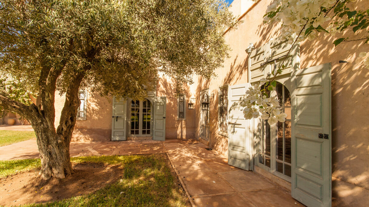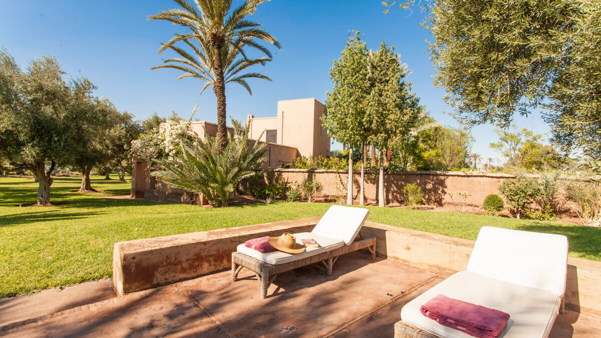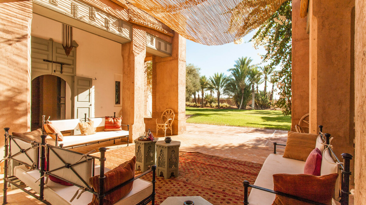 Les nombreuses terrasses ombragées de la maison, largement ouvertes sur les oliviers et les palmiers du jardin, permettent de profiter du cadre enchanteur de la Palmeraie en totale intimité.
