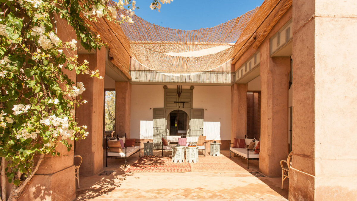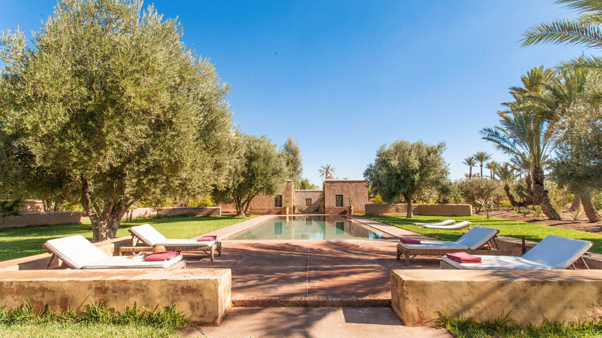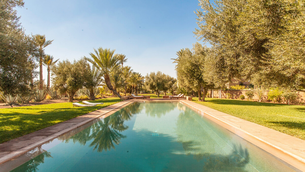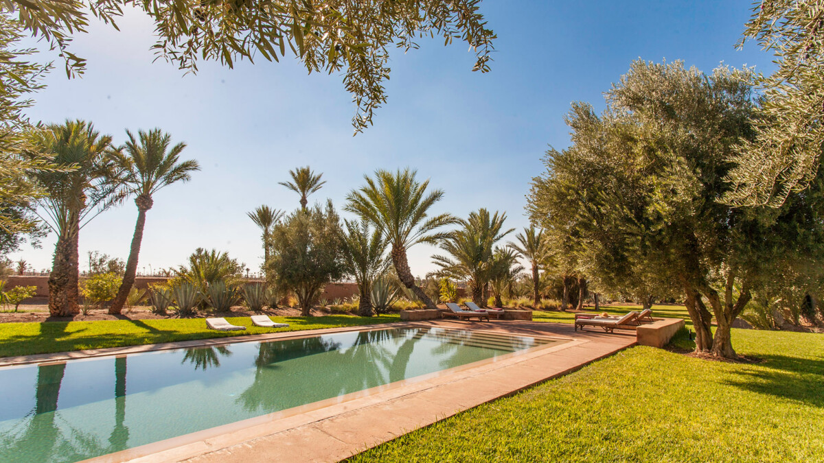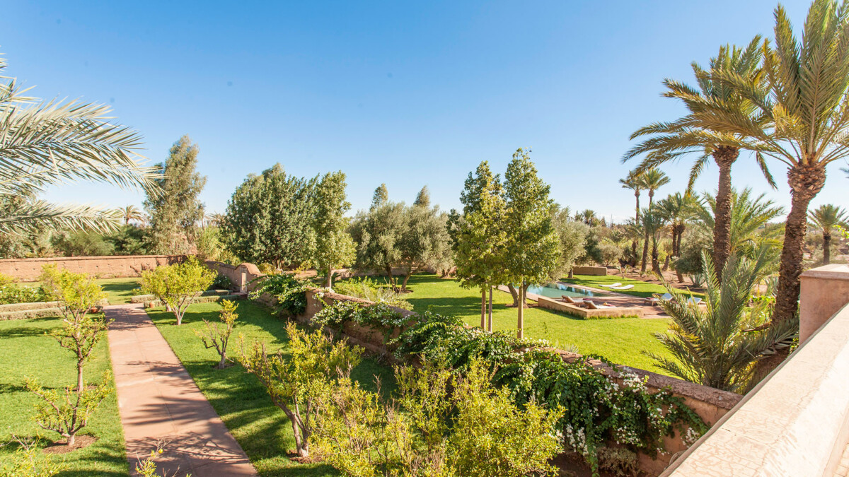 Les nombreuses terrasses ombragées de la maison, largement ouvertes sur les oliviers et les palmiers du jardin, permettent de profiter du cadre enchanteur de la Palmeraie en totale intimité.