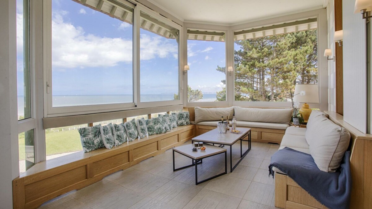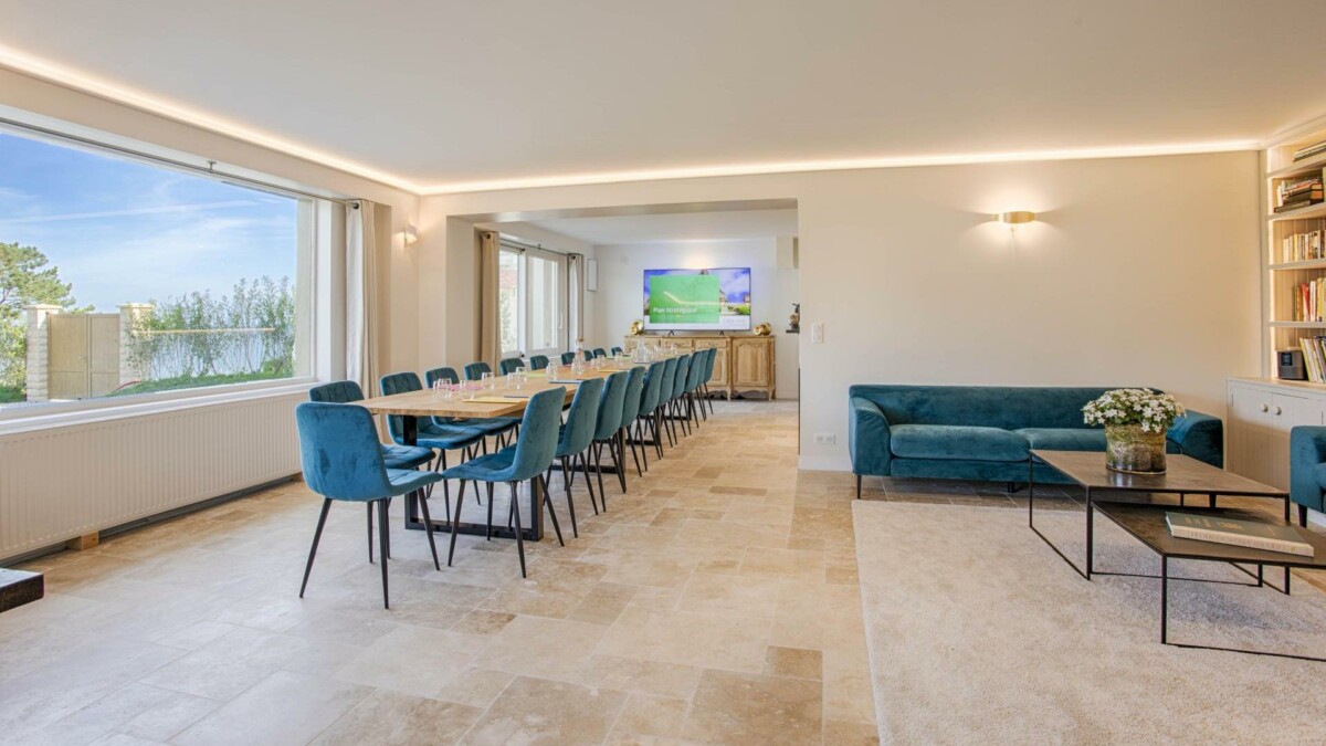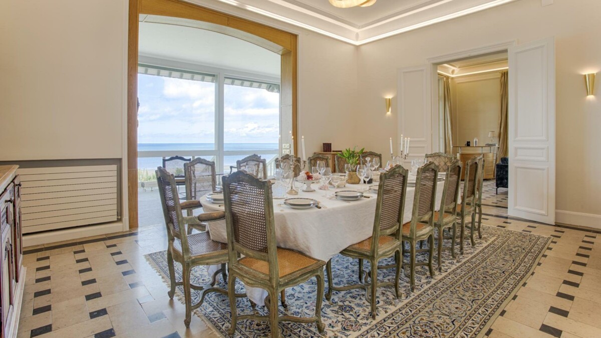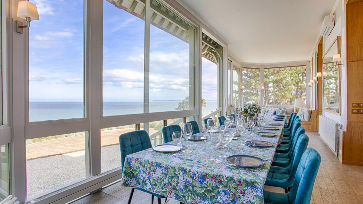 - La salle à manger peut accueillir de grands groupes, avec de larges baies vitrées offrant une vue sur le jardin et la mer.