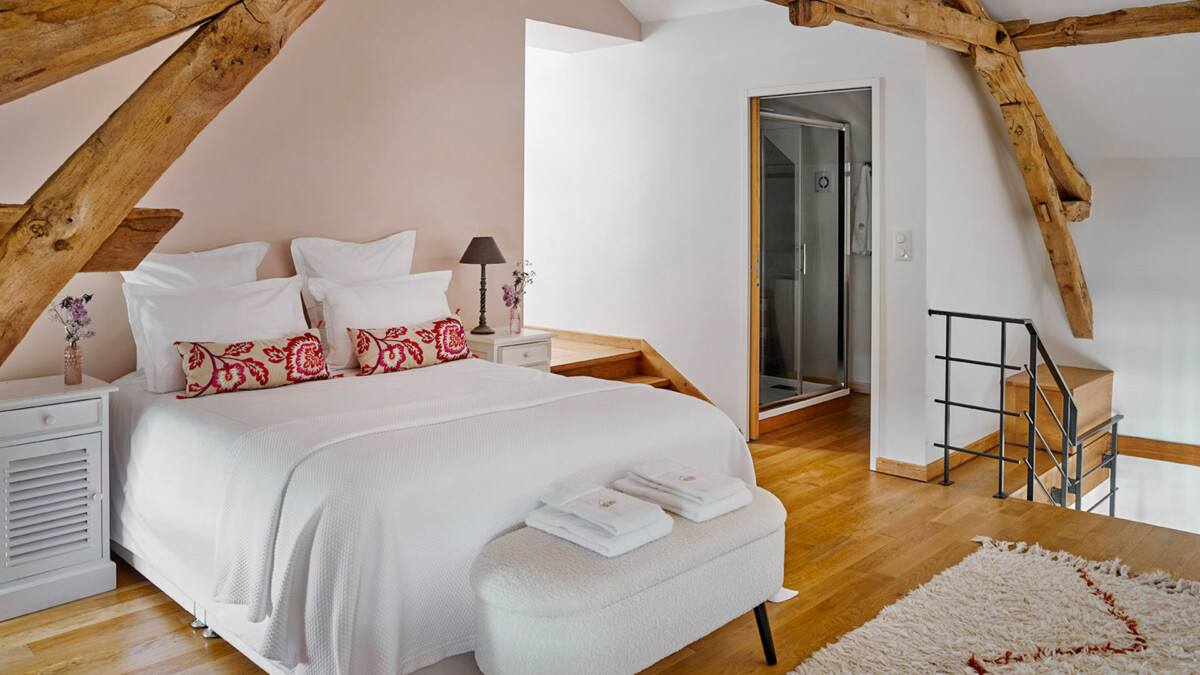 Chambre, 1er étage. La chambre propose 1 lit double 180 cm. Salle de bain privée, avec douche. La chambre inclut également : terrasse privée.