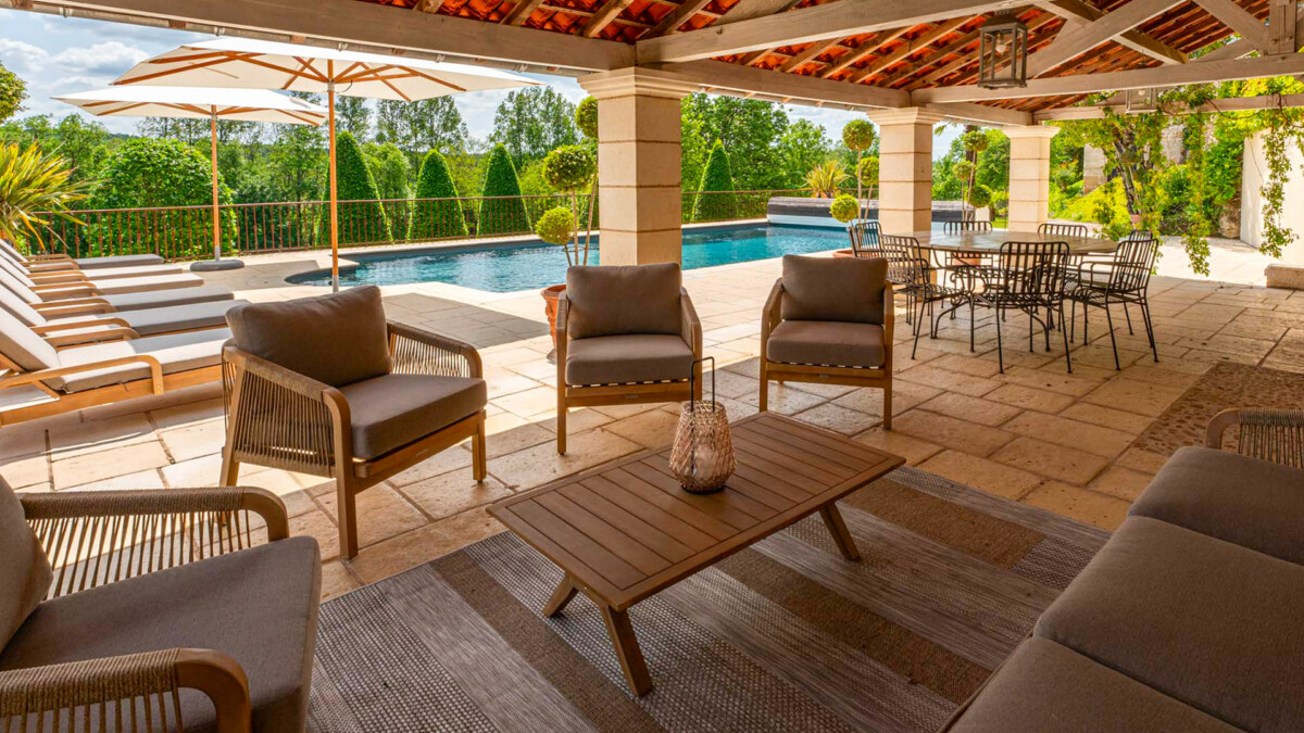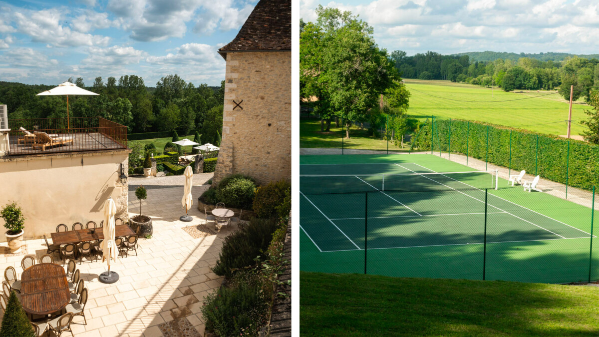 Les hôtes pourront profiter de terrasses, de différents espaces lounge et de repas, d’un pool house aménagé (avec espace repas, chaises longues, réfrigérateur-congélateur Américain, barbecue au gaz et cheminée à feu ouvert), d’un court de tennis, de balançoires et de trails de 3 et 6km.