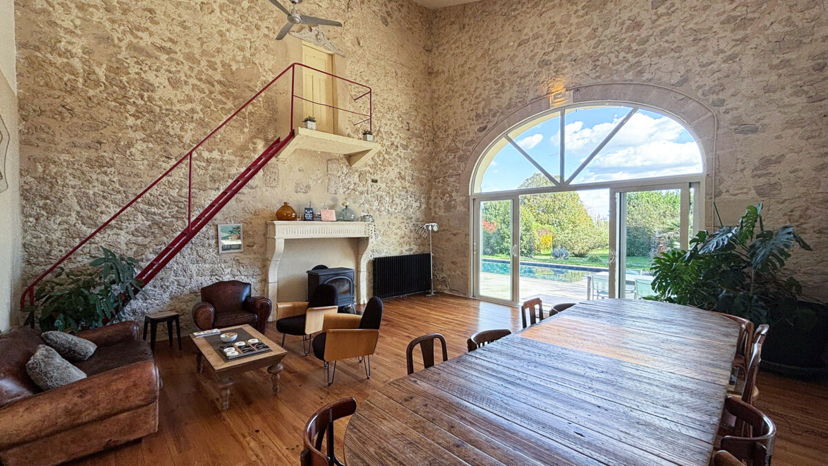 La grande cuisine, aménagée dans l’ancien chai, offre un espace fonctionnel et élégant pour préparer de succulents repas. Le vaste séjour/salle à manger est le cœur battant de la maison, avec une grande table prête à accueillir tous vos convives pour des repas inoubliables. Un second salon se distingue par son vidéoprojecteur, transformant les soirées en véritables moments cinéma. La connexion Wi-Fi fibre assure par ailleurs que vous restiez connecté sur l’ensemble du domaine.