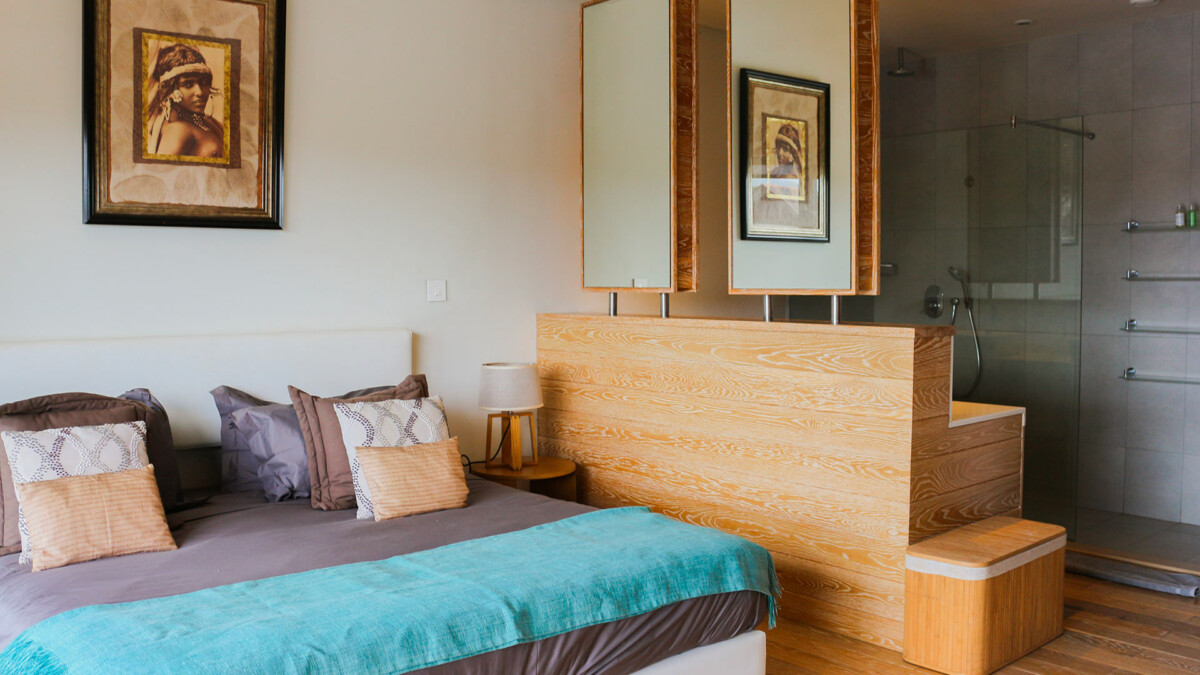 Chambre. La chambre propose 1 lit double Queen size. Salle de bain attenante. WC dans la salle de bain.