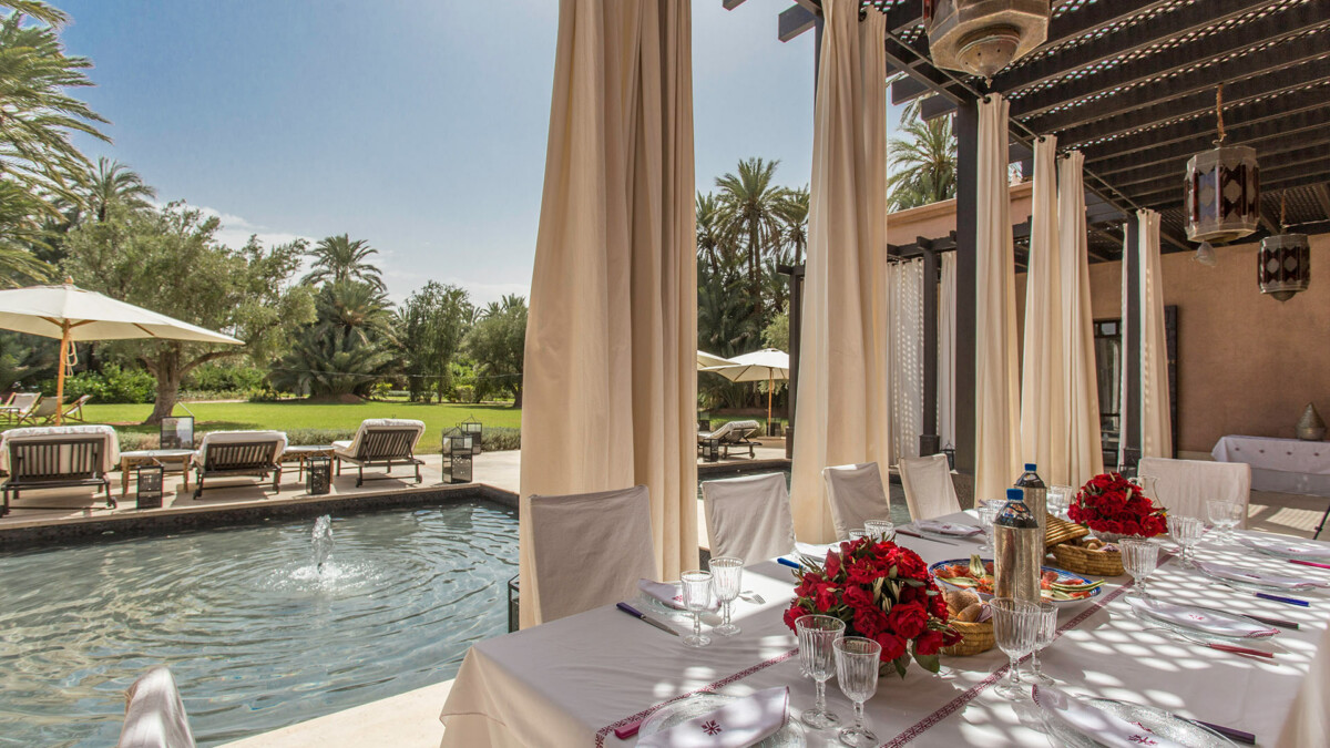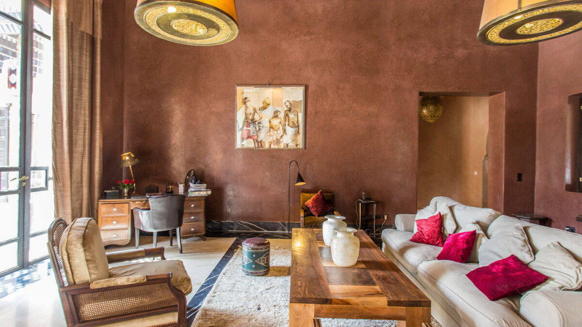 El Jenna est organisée autour d’un patio central dans un esprit typiquement oriental. Le patio très arboré est un havre de paix idéal pour déjeuner ou petit-déjeuner. Le patio donne accès aux différents salons et à la salle à manger d’esprit marocain qui peut accueillir jusqu’à 20 personnes autour de tables rondes. Le grand salon principal équipé d’une cheminée s’ouvre sur une très grande terrasse avec des transats et parasols, d’une salle à manger d’extérieur et de coin salon pour prendre un verre.