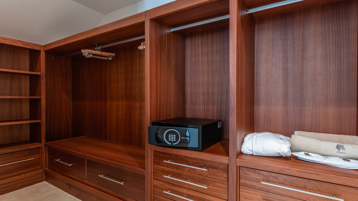 Chambre, 1er étage. La chambre propose 1 lit double King size. Salle de bain privée, avec baignoire, douche. WC dans la salle de bain. La chambre inclut également : climatisation, table de bureau, salon, TV, coffre fort, dressing, balcon.