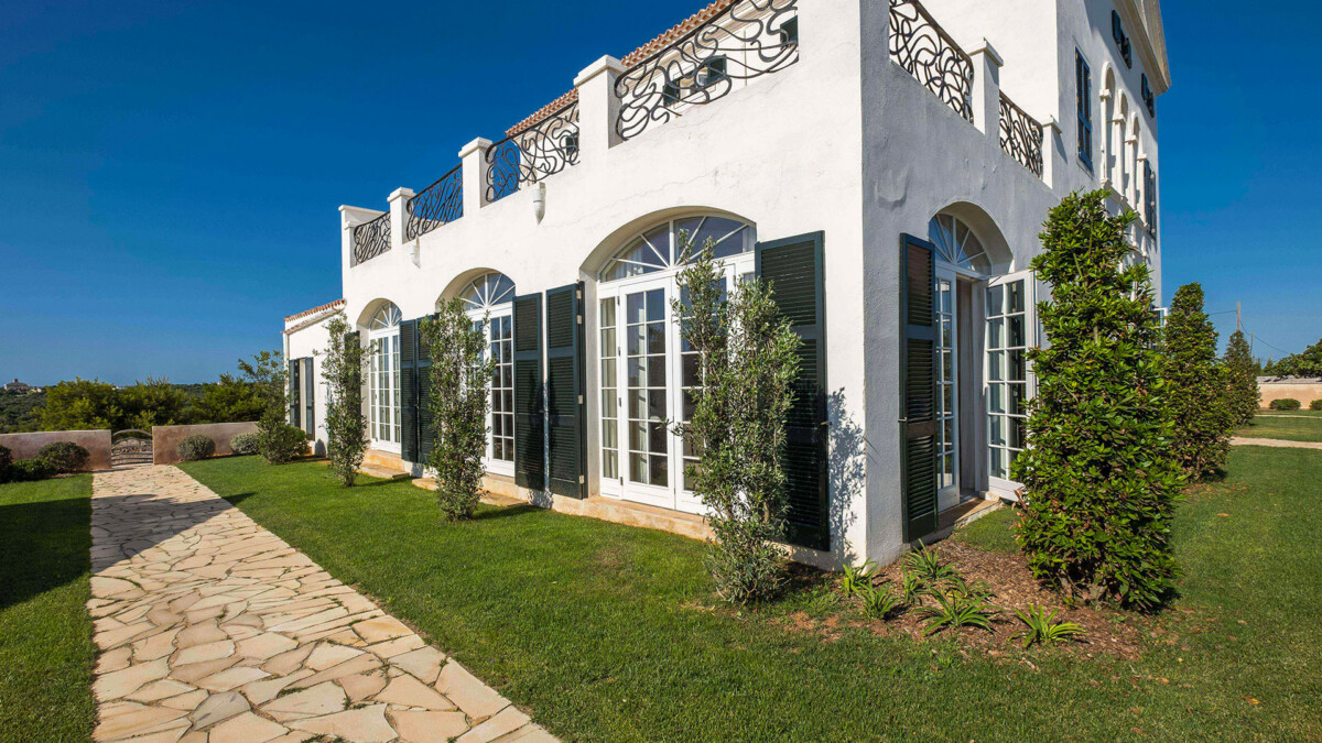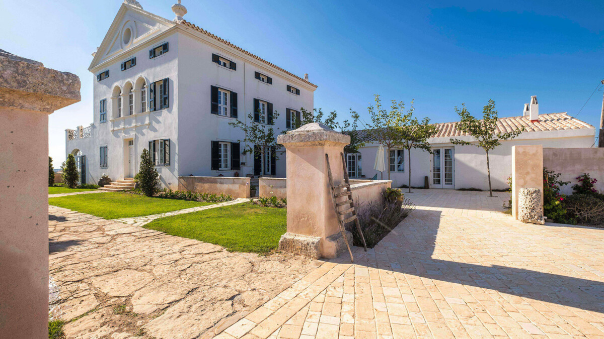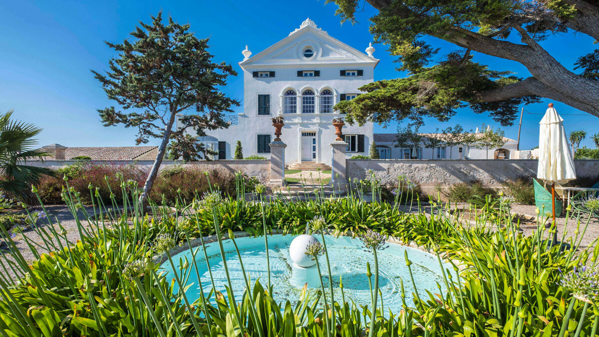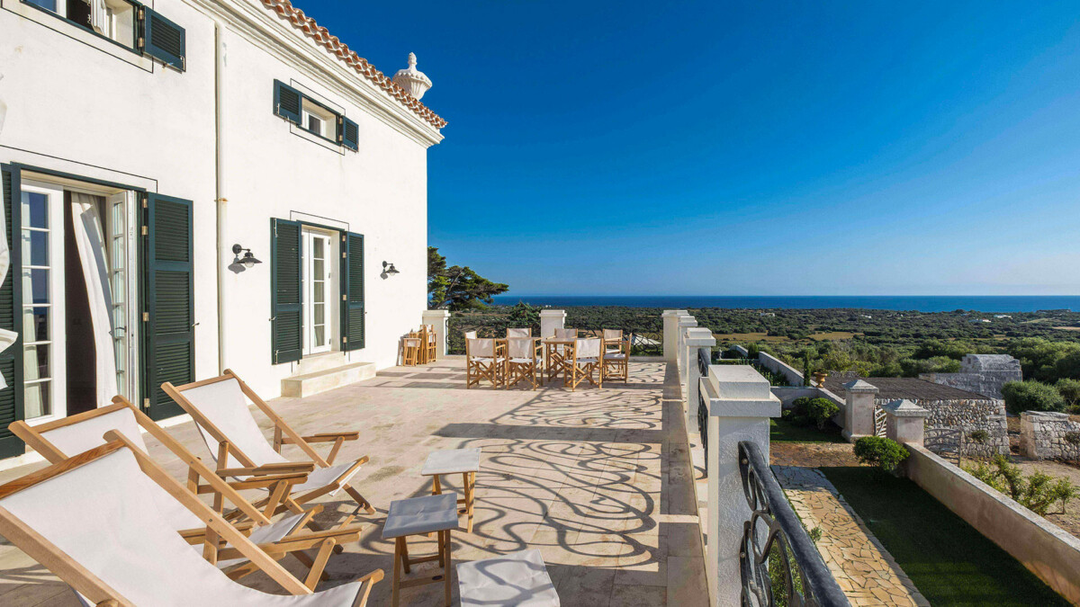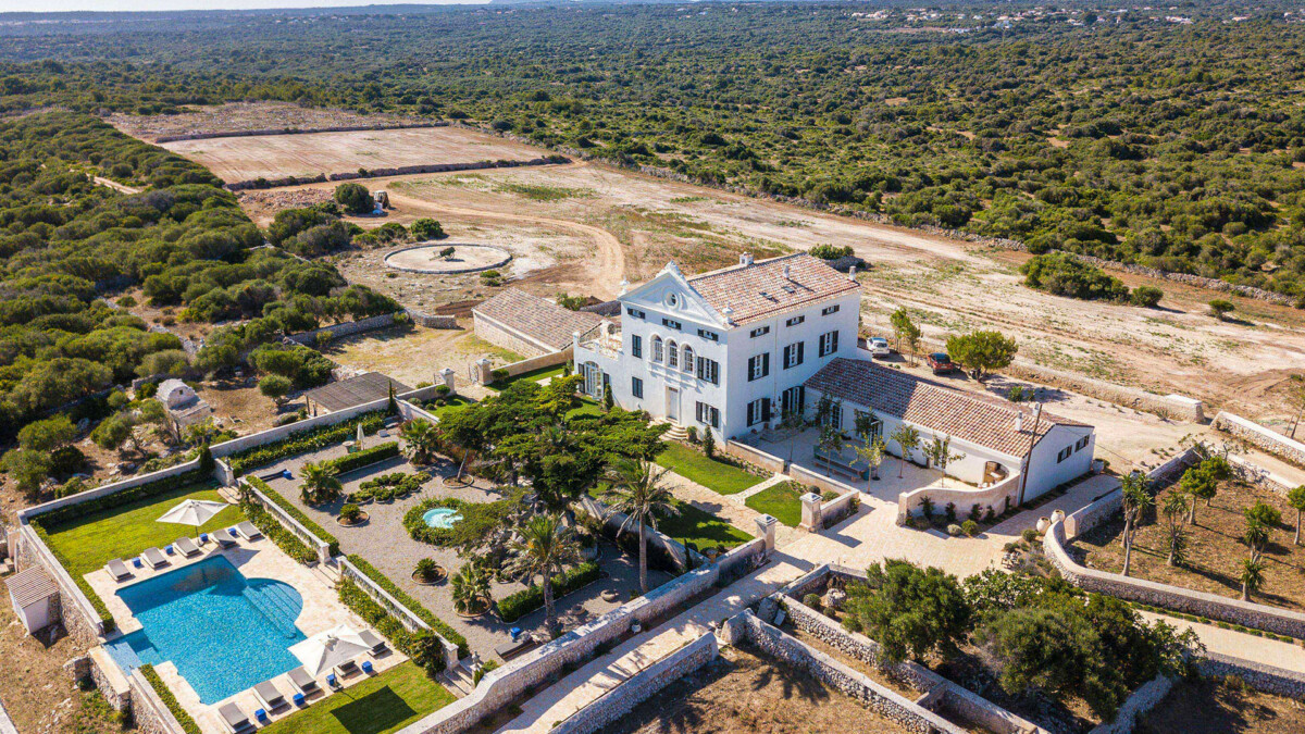 Cette grande villa de 6 chambres récemment rénovée est une vaste demeure seigneuriale traditionnelle sur 64 hectares au milieu des oliviers et plongeant sur la mer Méditerranée à Minorque.