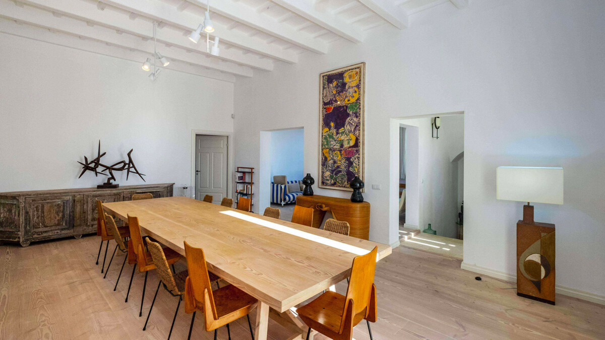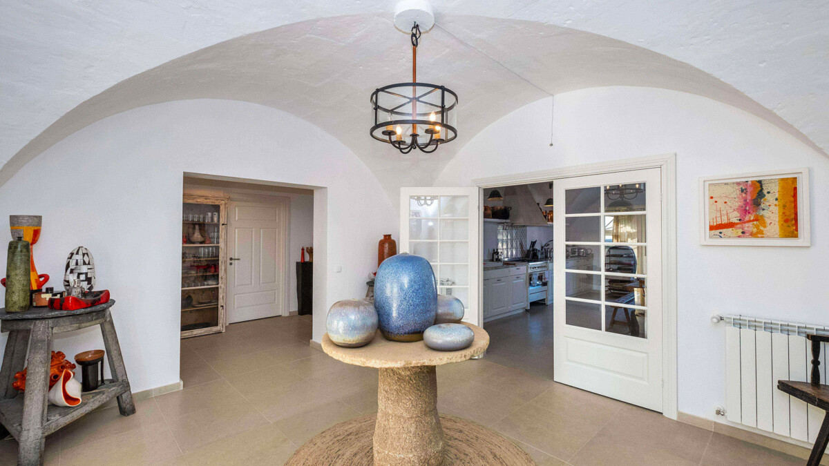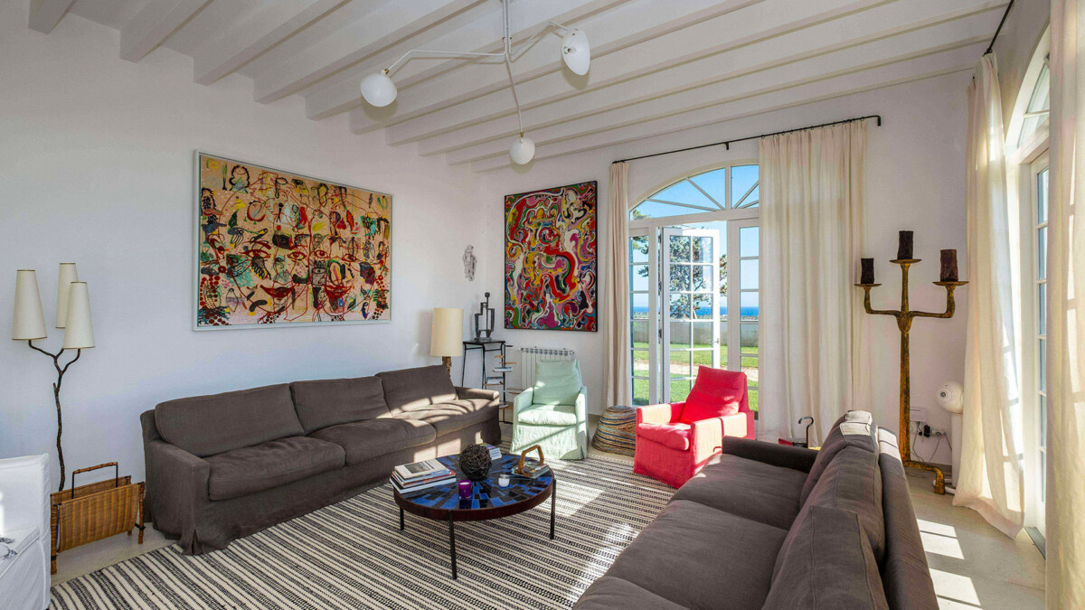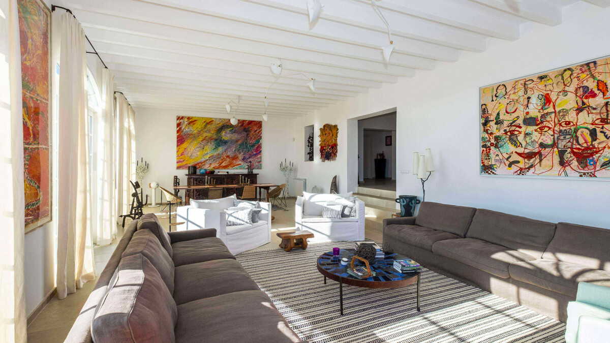 Les intérieurs sont spacieux et lumineux. La maison comportent 3 salons et de nombreuses ouvres d’art. En montant au premier étage, vous pourrez juger par vous-même de la situation exceptionnelle de la maison grâce aux splendides vues sur la moitié de l’île et sur la mer que vous découvrirez. C’est aussi l’endroit parfait pour admirer un coucher du soleil en fin de journée.