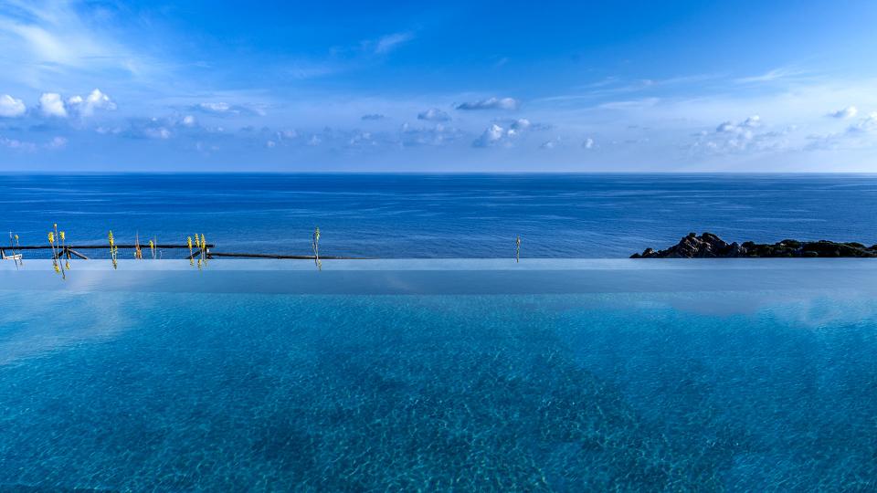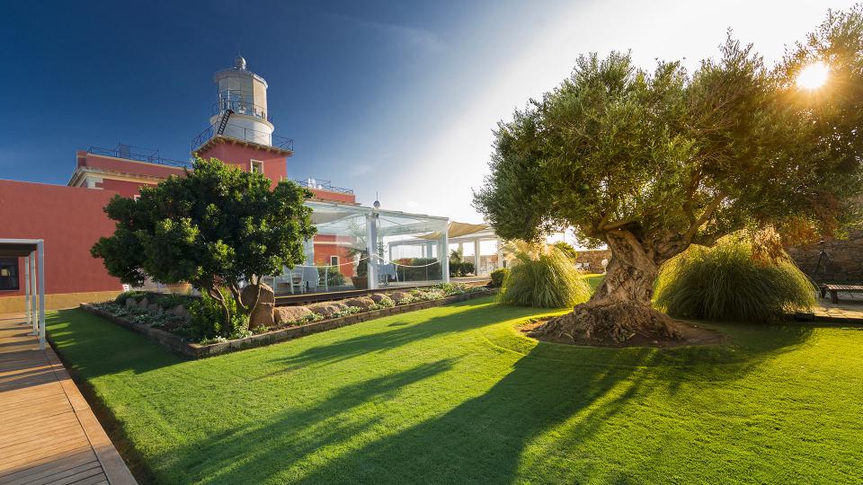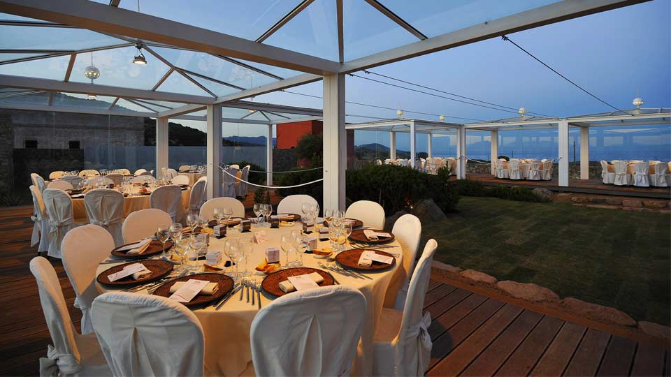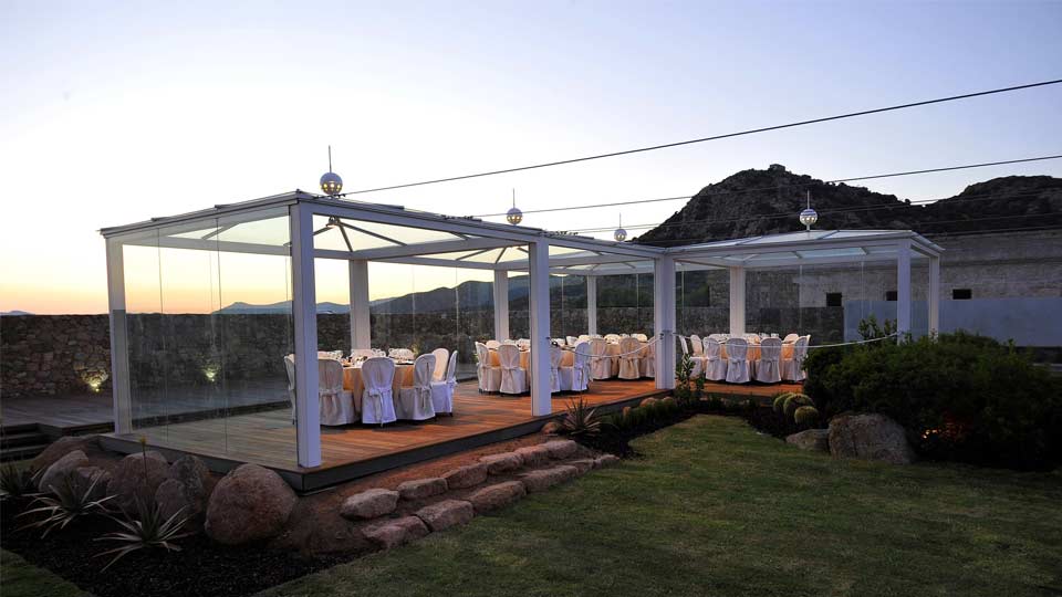 Au milieu du jardin, il y a huit belvédères de verre (16 m² chacune) et une zone abritée avec des tables où il est possible de déjeuner en plein air en admirant la vue panoramique sur la mer et les collines.