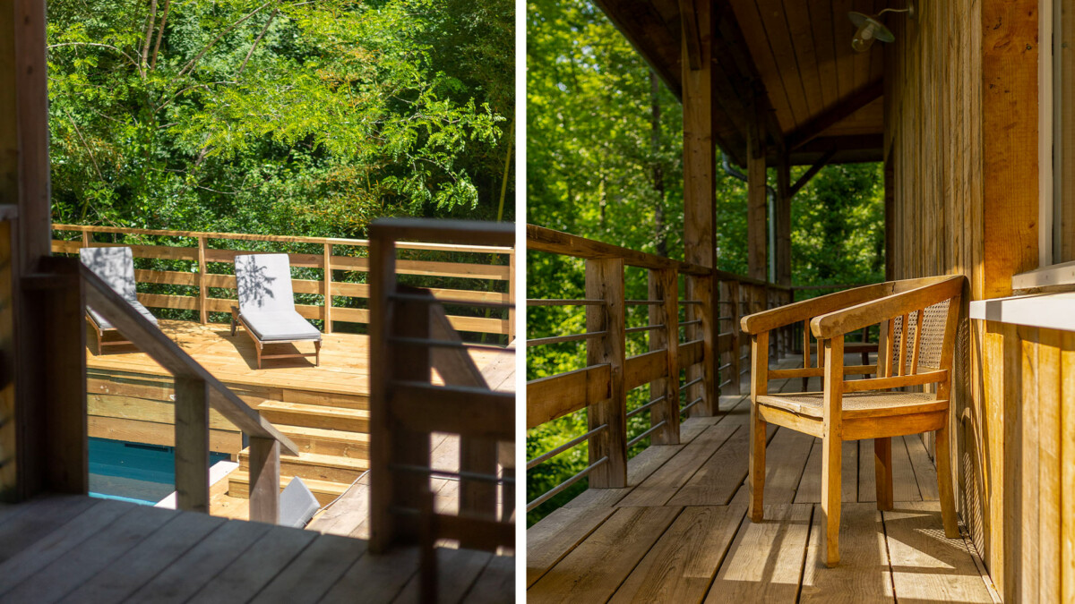 Vous apprécierez la terrasse perchée sur la canopée et équipée d’une plancha, idéale pour partager des moments de convivialité avec vos proches autour d’un bon repas tout en profitant de la nature environnante.