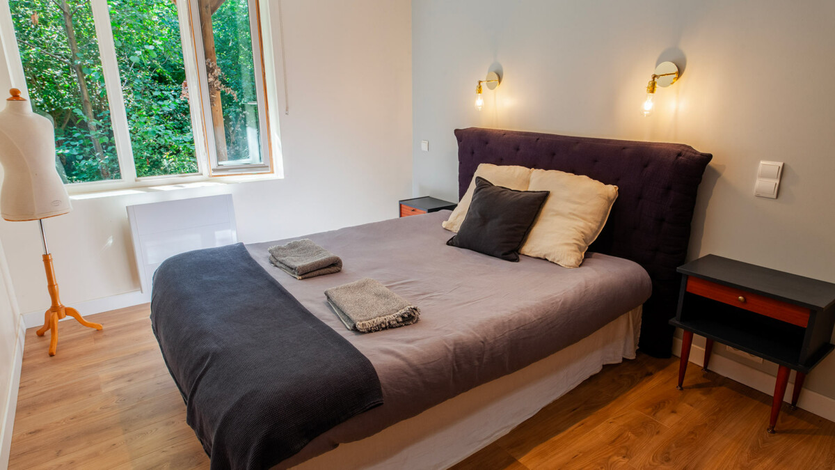 Chambre, Rez de jardin. La chambre propose 1 lit double 180 cm. Salle de bain partagée.