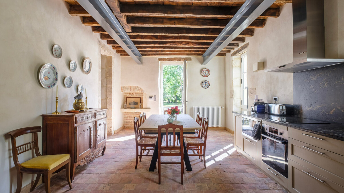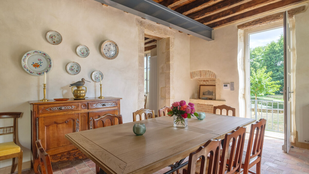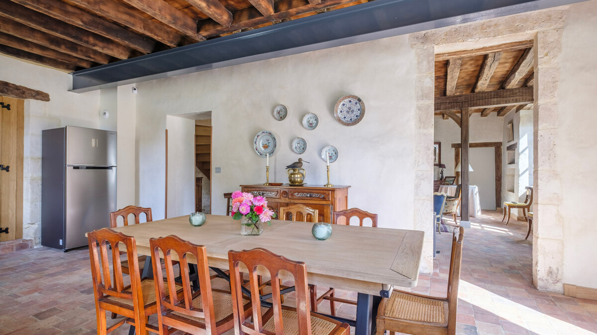 La salle à manger contiguë au salon est idéale pour partager des repas conviviaux en famille ou entre amis. Elle est adjacente à une cuisine entièrement équipée. Vous retrouverez également quatre chambres doubles, chacune dotée de sa propre salle de bain privative. Parmi elles, une suite est située au rez-de-chaussée, idéale pour les personnes recherchant un accès facile. Les chambres à l’étage offrent une vue splendide sur la rivière Bouzanne.