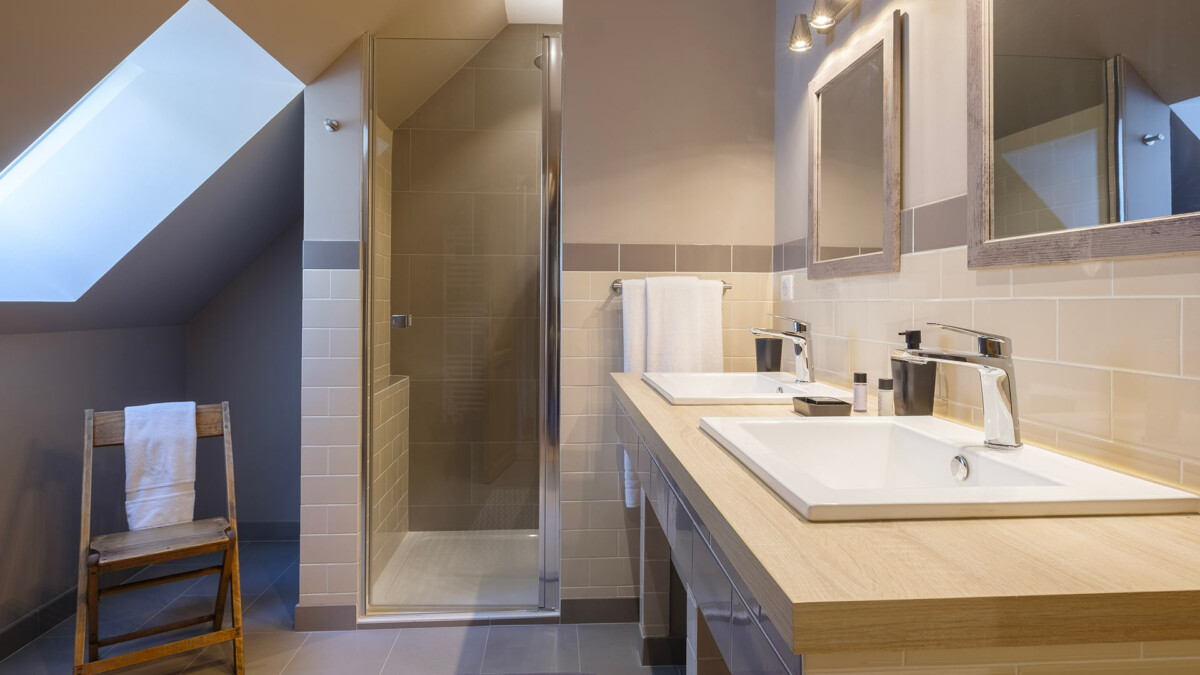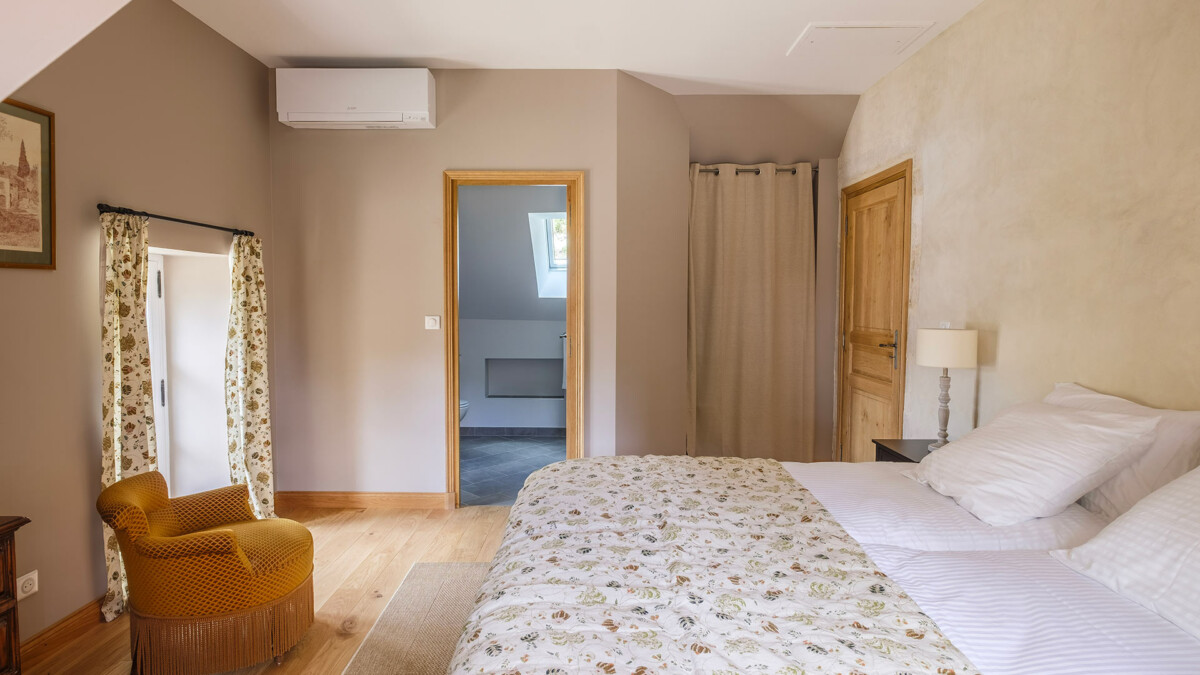 Chambre, Rez-de-chaussée. La chambre propose 1 lit double 180 cm. Salle de bain privée.