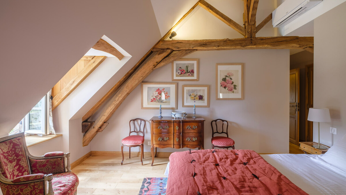 Chambre, 1er étage. La chambre propose 1 lit double 180 cm. Salle de bain privée.