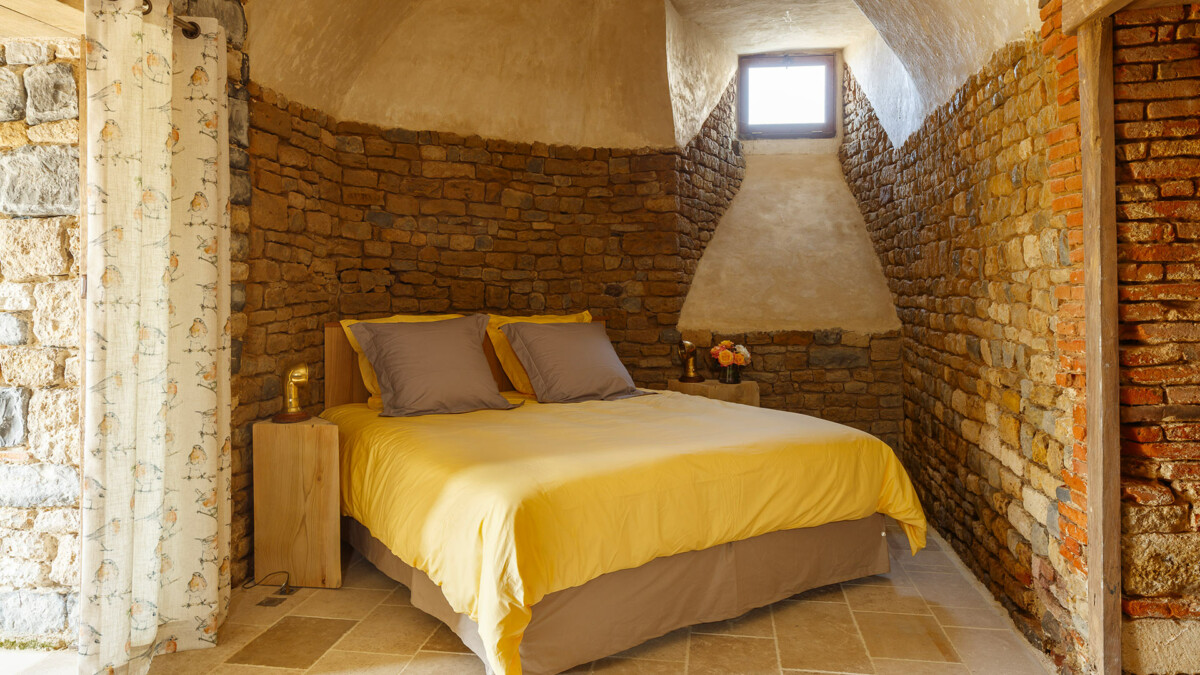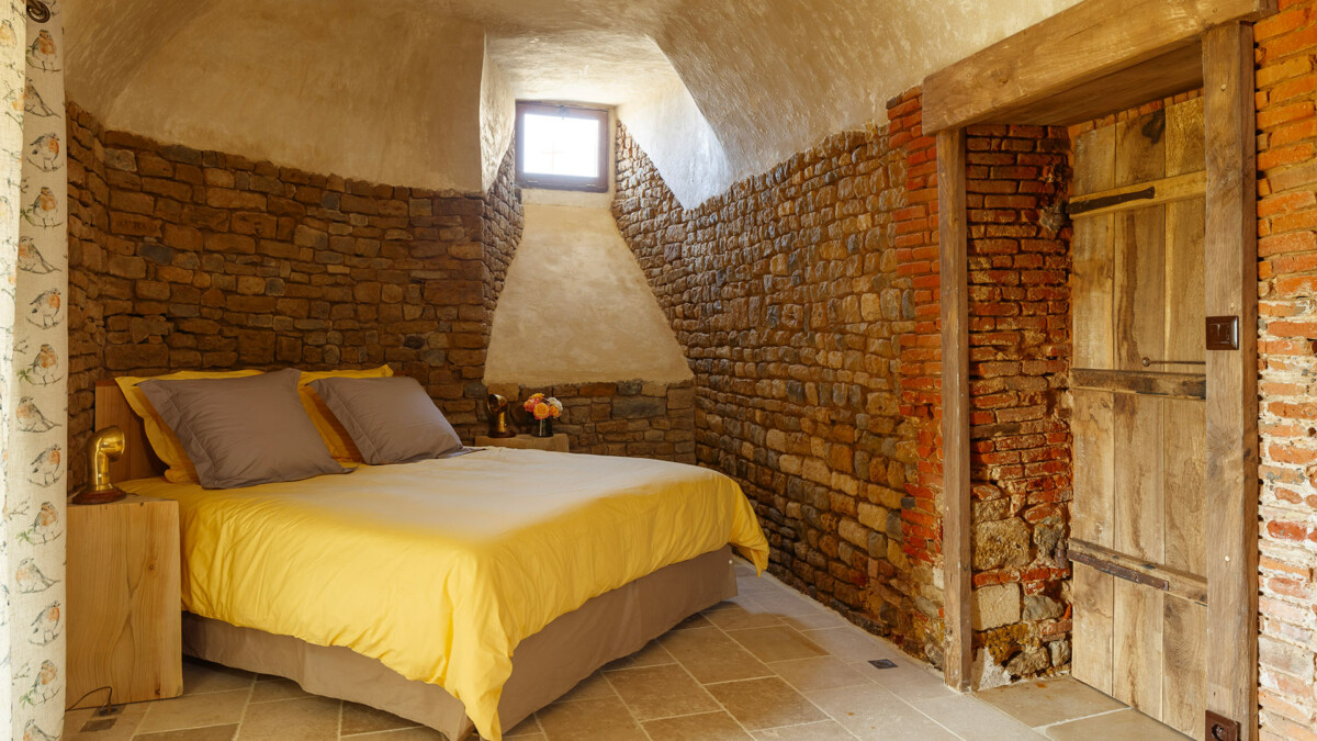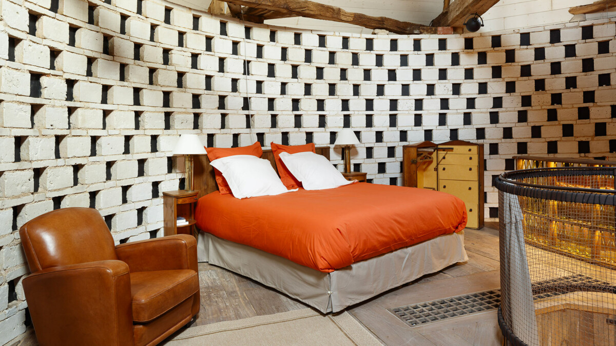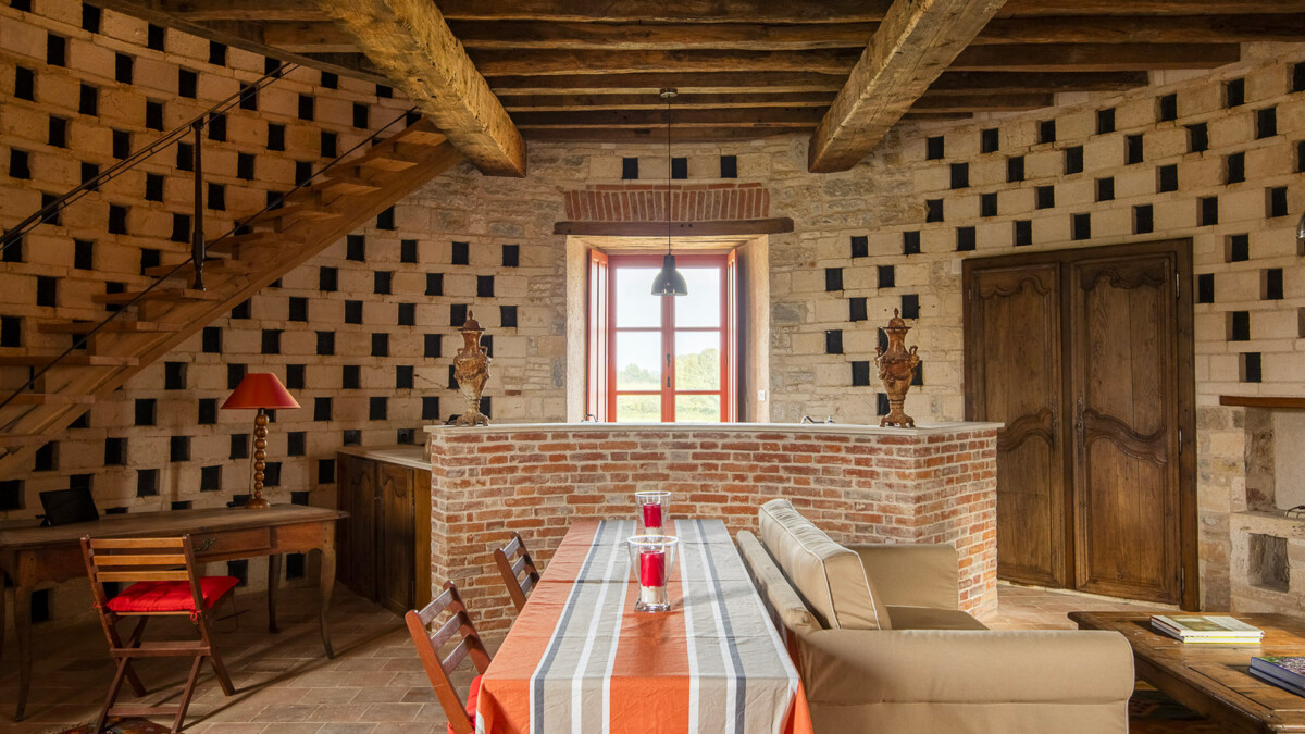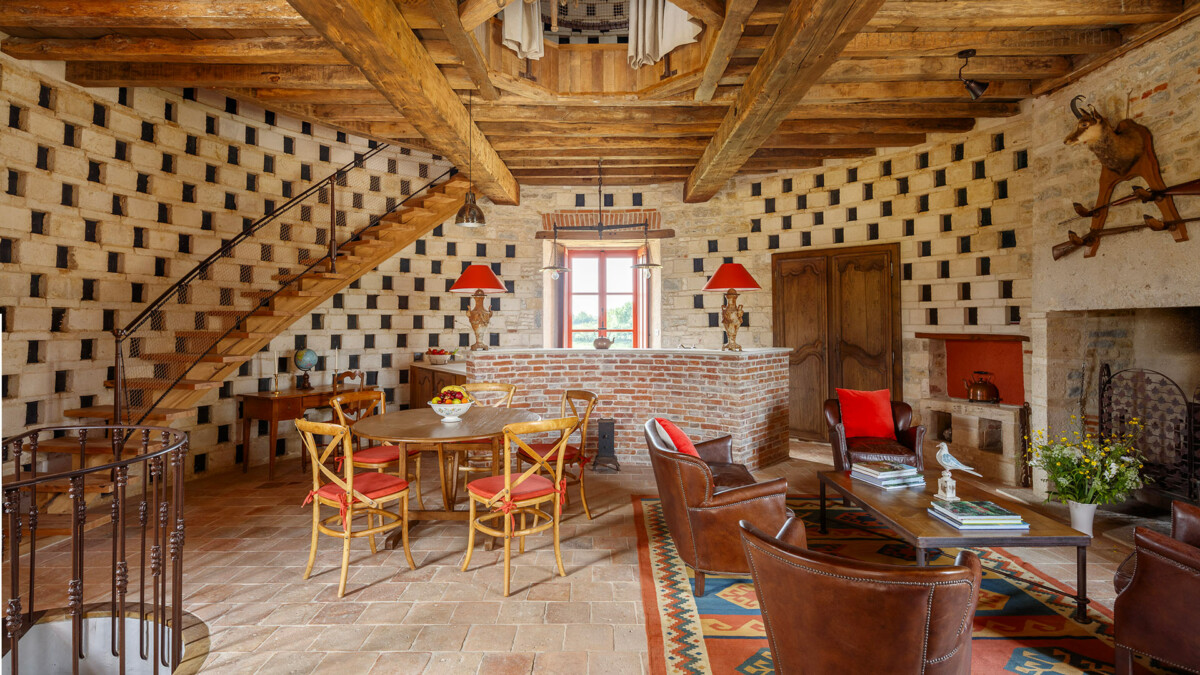 Sur les murs, plus de 2000 trous de boulin ayant servi autrefois de nichoir aux pigeons ont été intégralement conservés et restaurés. Dans cet endroit résolument extravagant et sensationnel aux allures de relais de chasse, la décoration aux couleurs chaudes contraste avec les murs faits de pierres et de briques, conférant au lieu une atmosphère profondément chaleureuse.