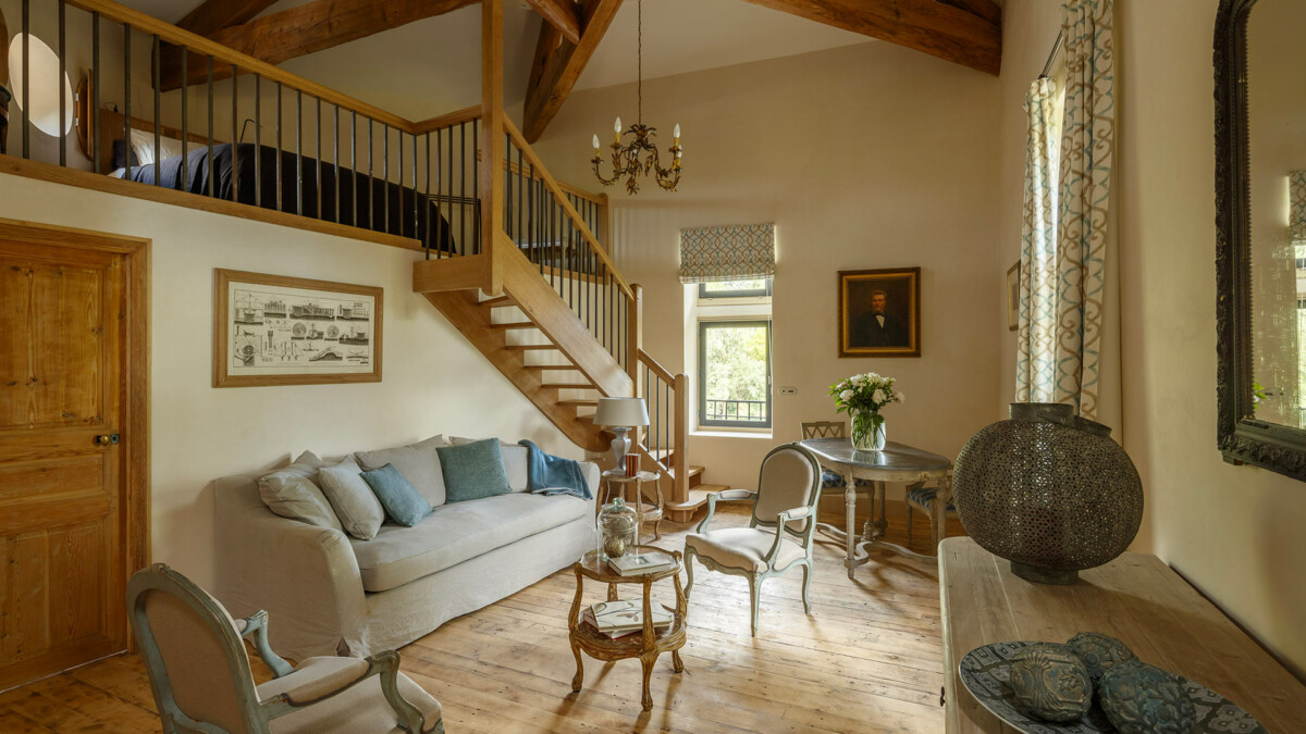 Sous son imposante charpente pentagonale et ses poutres centenaires, le premier étage offre trois chambres, chacune d’entre elles dotées d’une vue splendide sur les vignes voisines et la rivière tumultueuse.