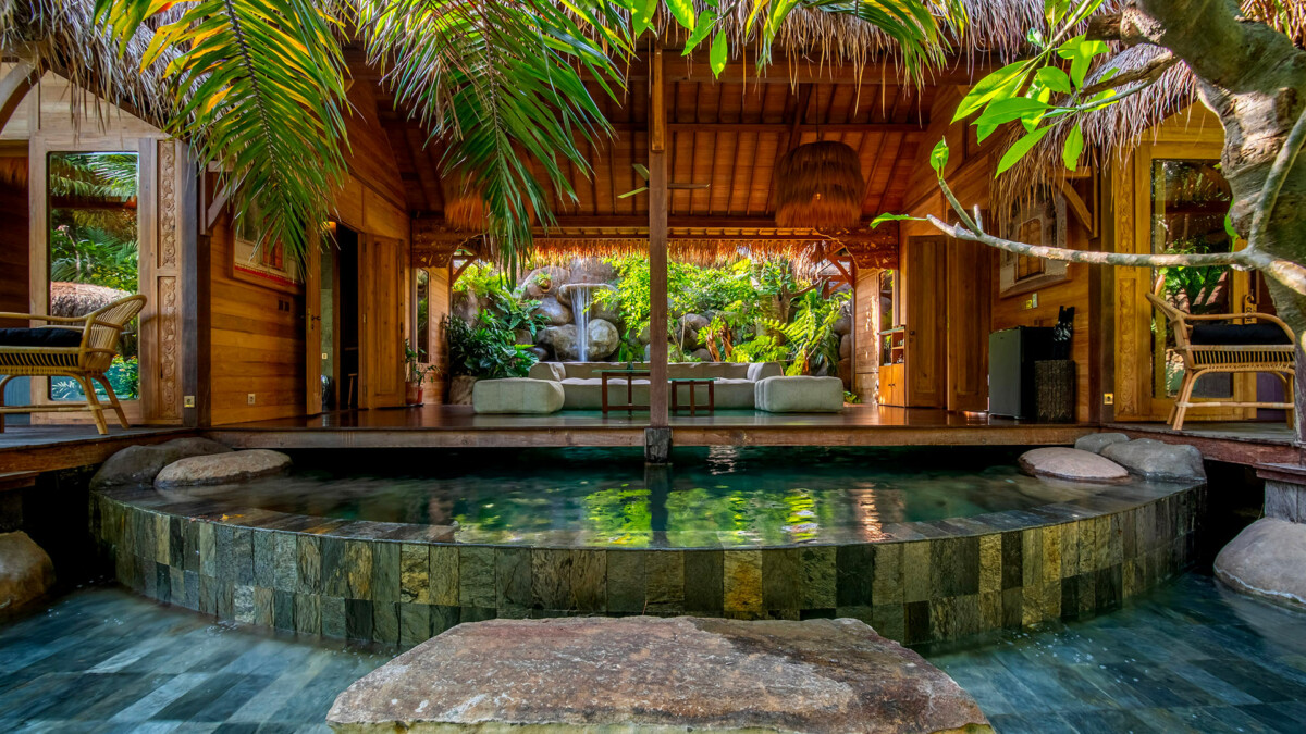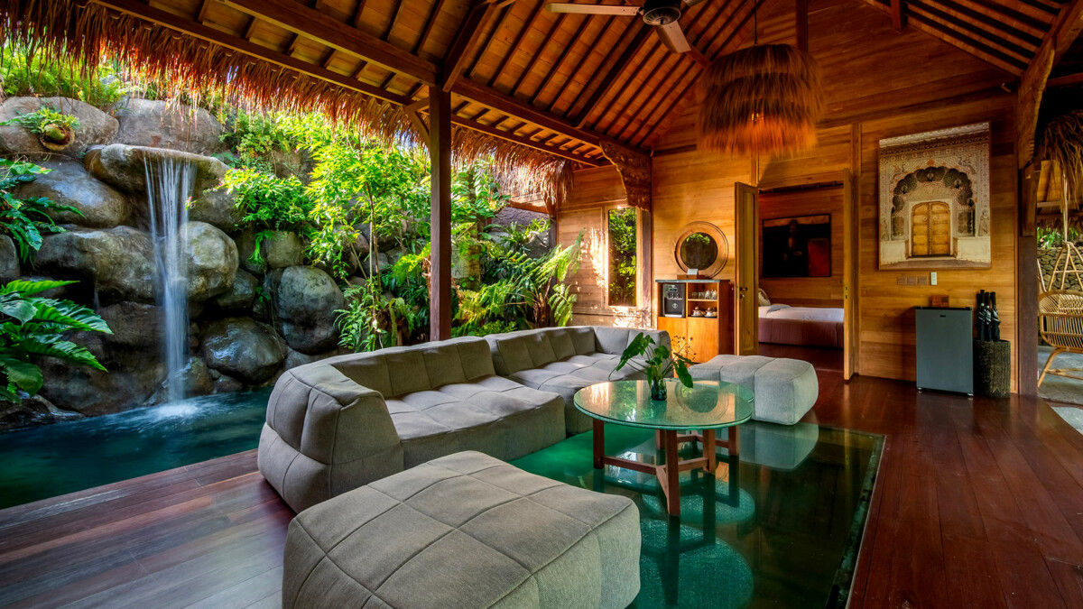 Là, l’intérieur s’efface en douceur devant la nature, grâce à une immense pièce à vivre ouverte sur un jardin intérieur, une piscine privée et une cascade. Le sol de verre magnifie la lumière, offrant l’impression de flotter. Le mobilier, entre tradition et modernité, crée un sentiment raffiné d’abandon chaleureux.