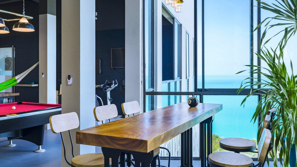 La villa est entièrement climatisée. Profitez de regarder vos films favoris sur la télévision à écran plat dotée du satellite avec chaînes internationales, ainsi que d’un système audio Bose avec WiFi et Bluetooth dans chaque chambre. Pour tous les amateurs de sport et de jeux, un espace de fitness et de divertissement est situé au niveau inférieur, y compris une table de ping-pong et un billard. Les éléments naturels s’invitent dans votre quotidien, la villa semblable à une cathédrale est naturellement rafraichie par le courant d’air venant de l’océan, vous garantissant ainsi une température intérieure agréable durant les journées d’été. Faites de vos rêves une réalité et appréciez un séjour luxueux au-dessus du golfe de Thaïlande sous le ciel étoilé de l’Asie!