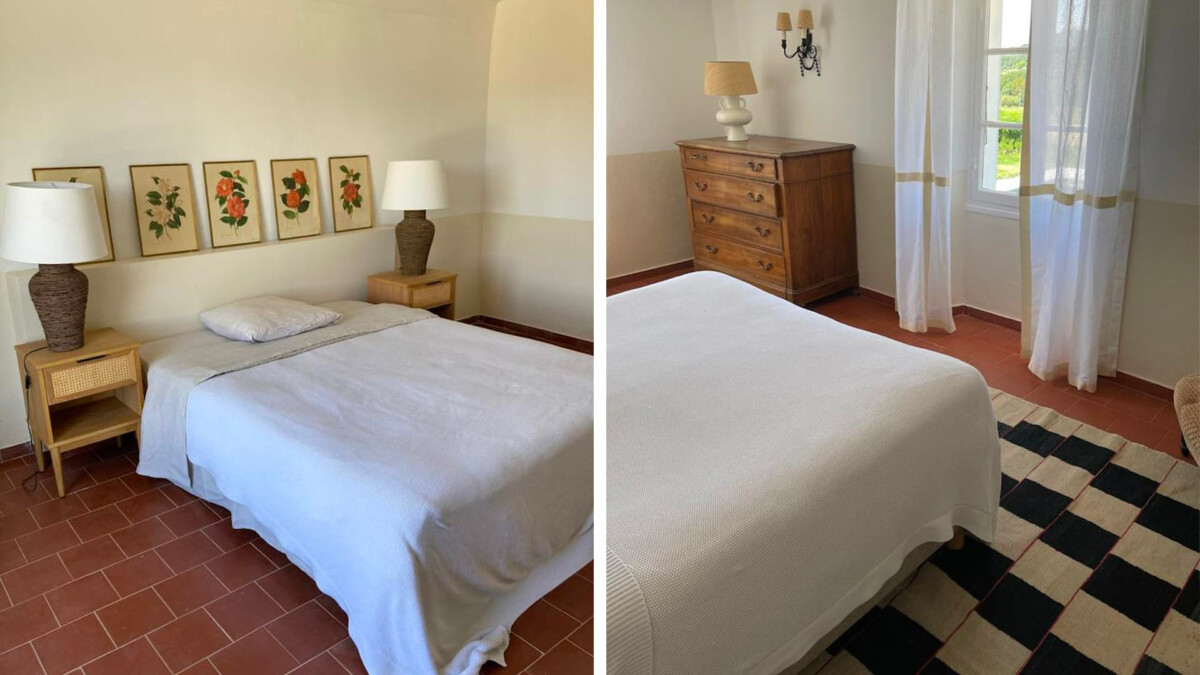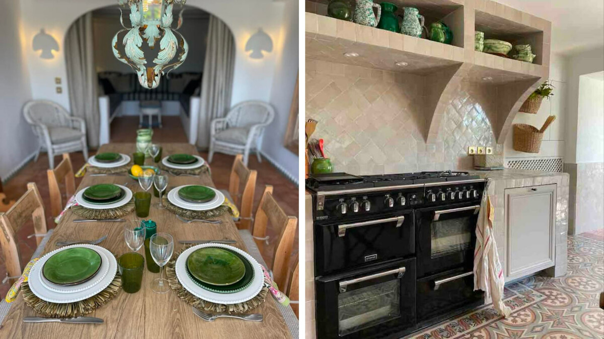 À l’intérieur, le mas révèle une splendide fusion de style et de fonctionnalité. Le salon principal est un espace de convivialité ouvert, doté de meubles élégants et de matériaux nobles. La cuisine, moderne et parfaitement équipée, s’intègre harmonieusement au salon, formant un espace de vie chaleureux et accueillant. L’accent est mis sur le cachet et le charme provençal, avec des détails décoratifs raffinés signés Alexis Mabille, qui apportent caractère et élégance à chaque recoin.