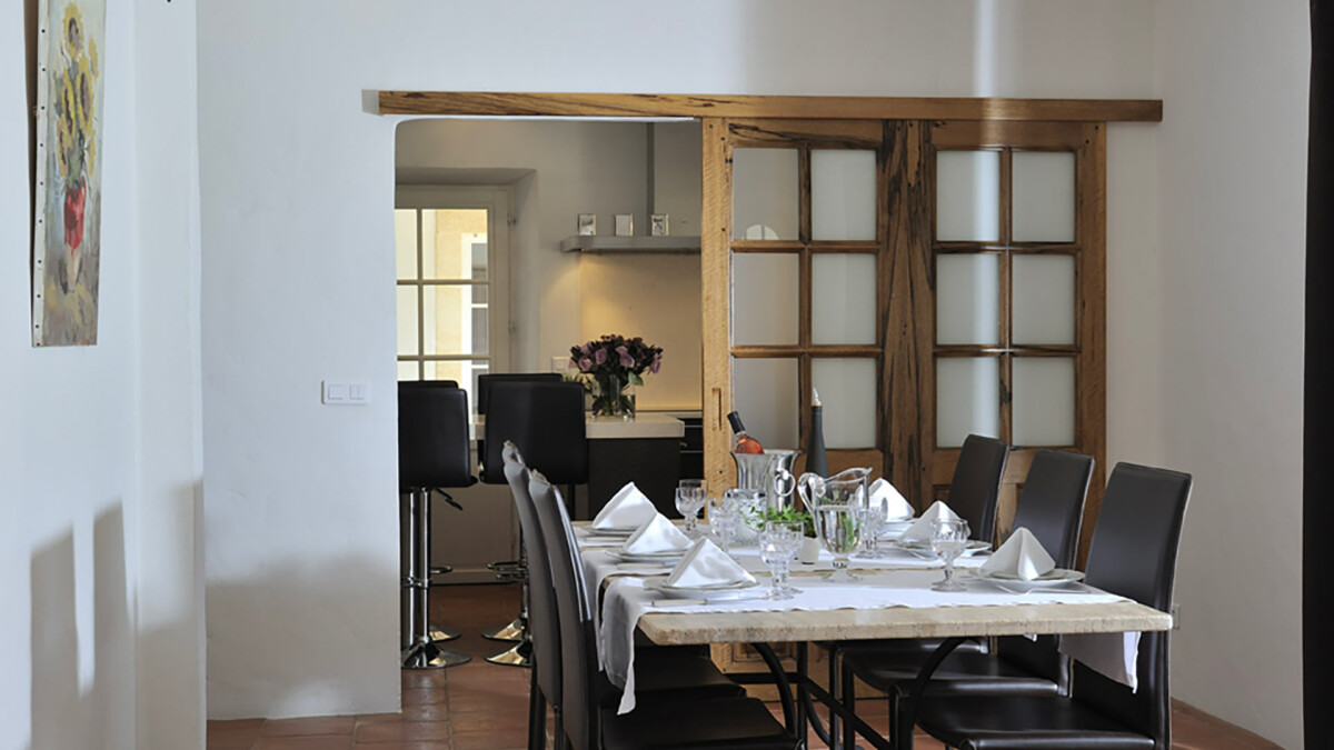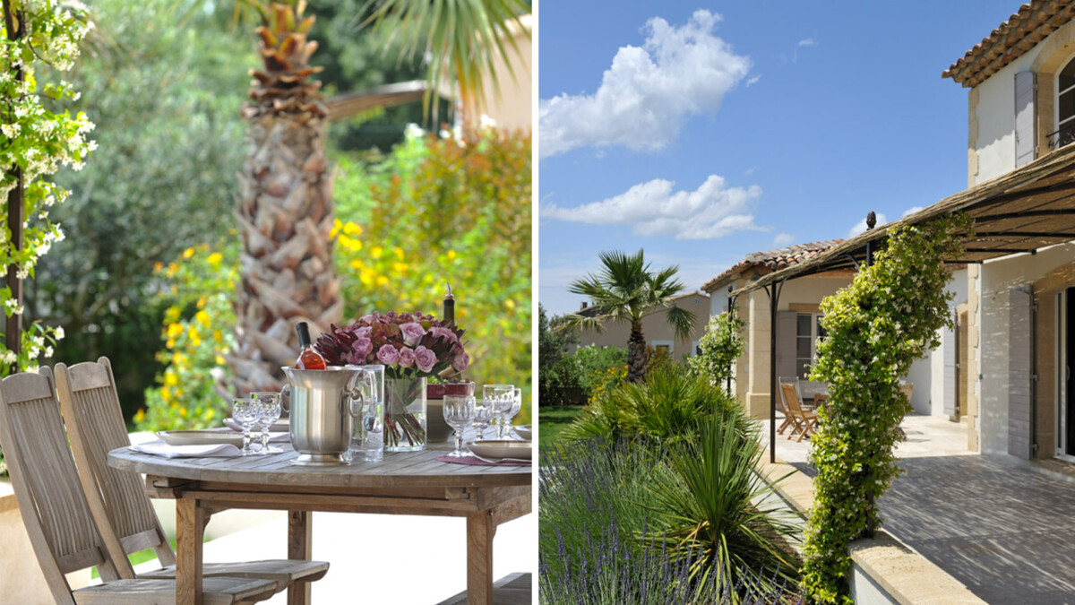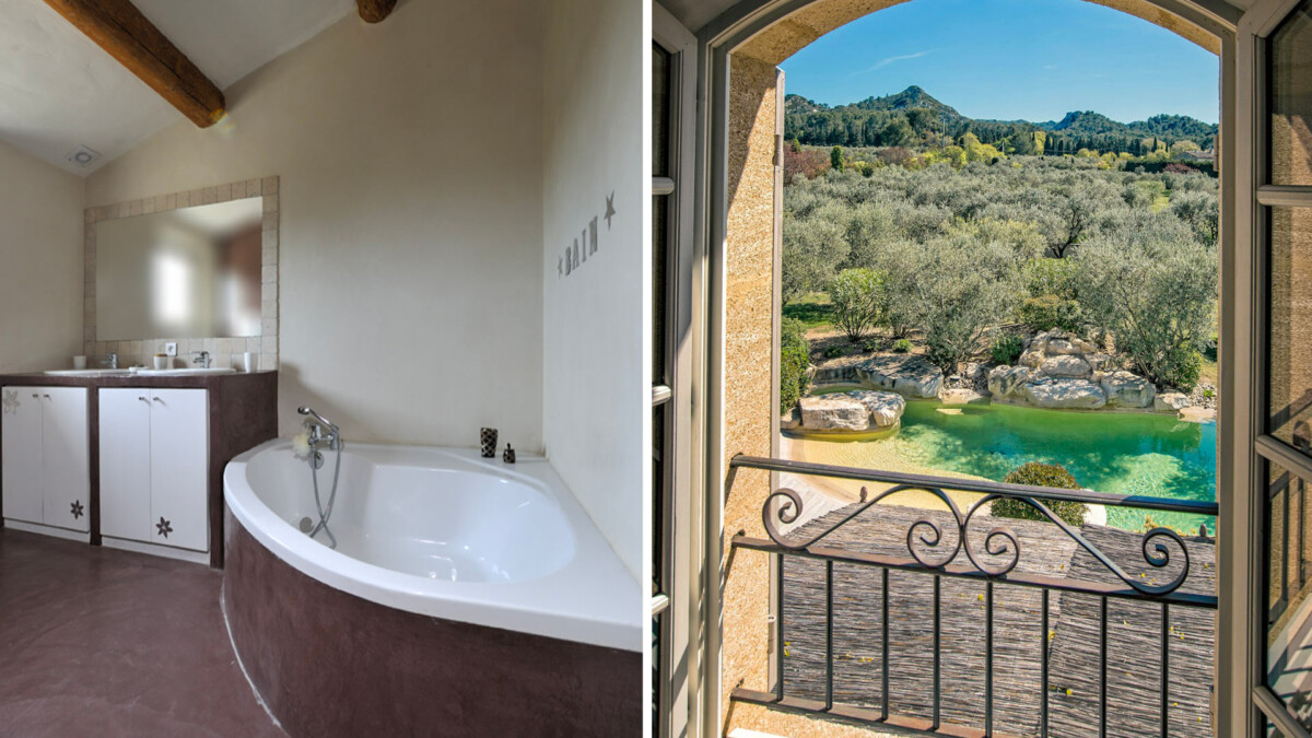 Les extérieurs de la villa sont tout aussi remarquables. La terrasse, accessible depuis la pièce à vivre et les chambres principales, offre une vue splendide sur les Alpilles. C’est l’endroit idéal pour profiter de repas en plein air ou simplement se détendre en admirant le paysage environnant.