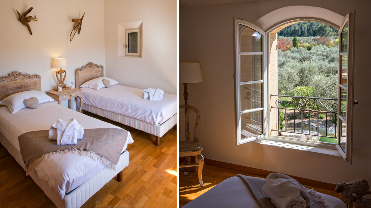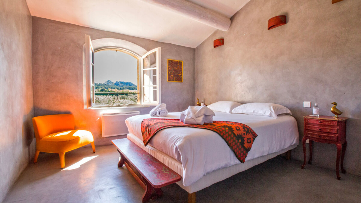 La chambre principale est un véritable havre de paix, équipée d’un magnifique dressing et d’une salle de bain privée. Une chambre annexe également munie de sa salle de bain privée complète cet espace, avec un accès direct au patio. Deux autres chambres, décorées différemment, l’une avec deux lits simples et l’autre avec un lit double, partagent une spacieuse salle de bain et bénéficient d’une vue imprenable sur les Alpilles.