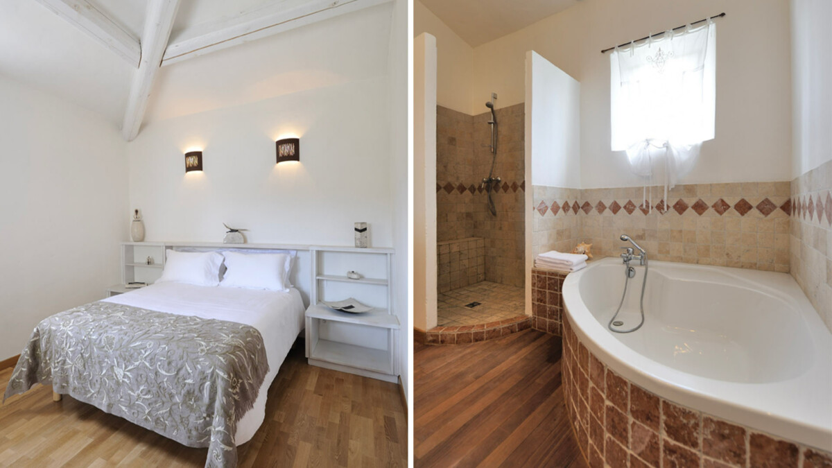 Chambre, Rez-de-chaussée. La chambre propose 1 lit double 160 cm. Salle de bain privée, avec 2 vasques, baignoire, douche. WC dans la salle de bain. La chambre inclut également : climatisation, dressing, terrasse privée, ventilateur.