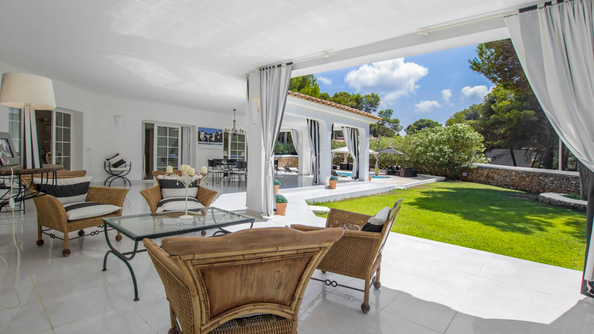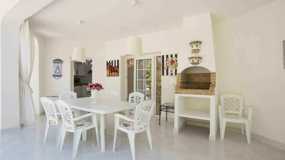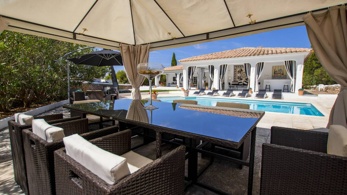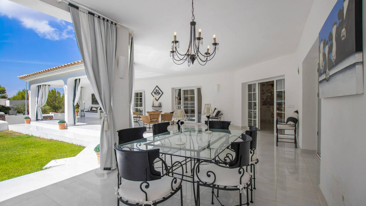 La villa dispose de 2 grandes terrasses couvertes: la 1ère à l’avant qui est équipée de différents espaces de repos, d’un espace repas, d’un espace bar. La 2ème se situe à l’arrière de la villa avec direct du salón et de la cuisine, idéale pour prendre le petit déjeuner et le déjeuner. Elle est équipée d’un coin repas et d’un barbecue Weber. Au bord de la piscine de 50 m2, vous trouverez une douche extérieure, un espace repas sous une tonnelle, ainsi qu’un espace lounge et 6 transats. Vous aves la possibilité de garer 2 voitures à l’intérieur du terrain.