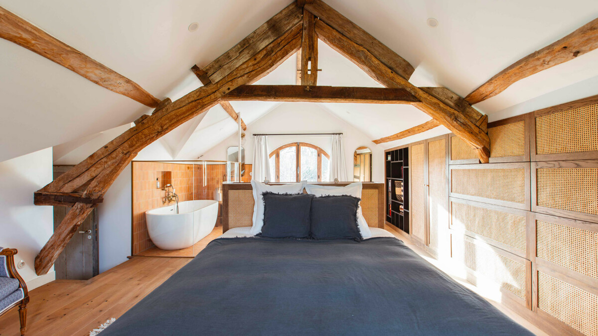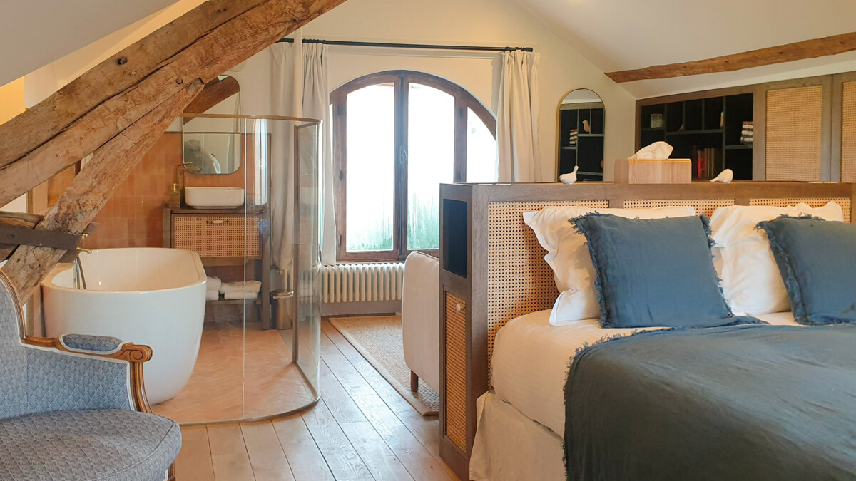 Chambre, 1er étage. La chambre propose 1 lit double 180 cm. Salle de bain privée, avec baignoire. WC partagés. La chambre inclut également : table de bureau, salon, dressing.