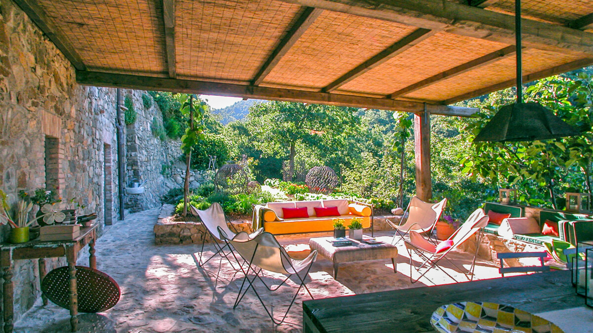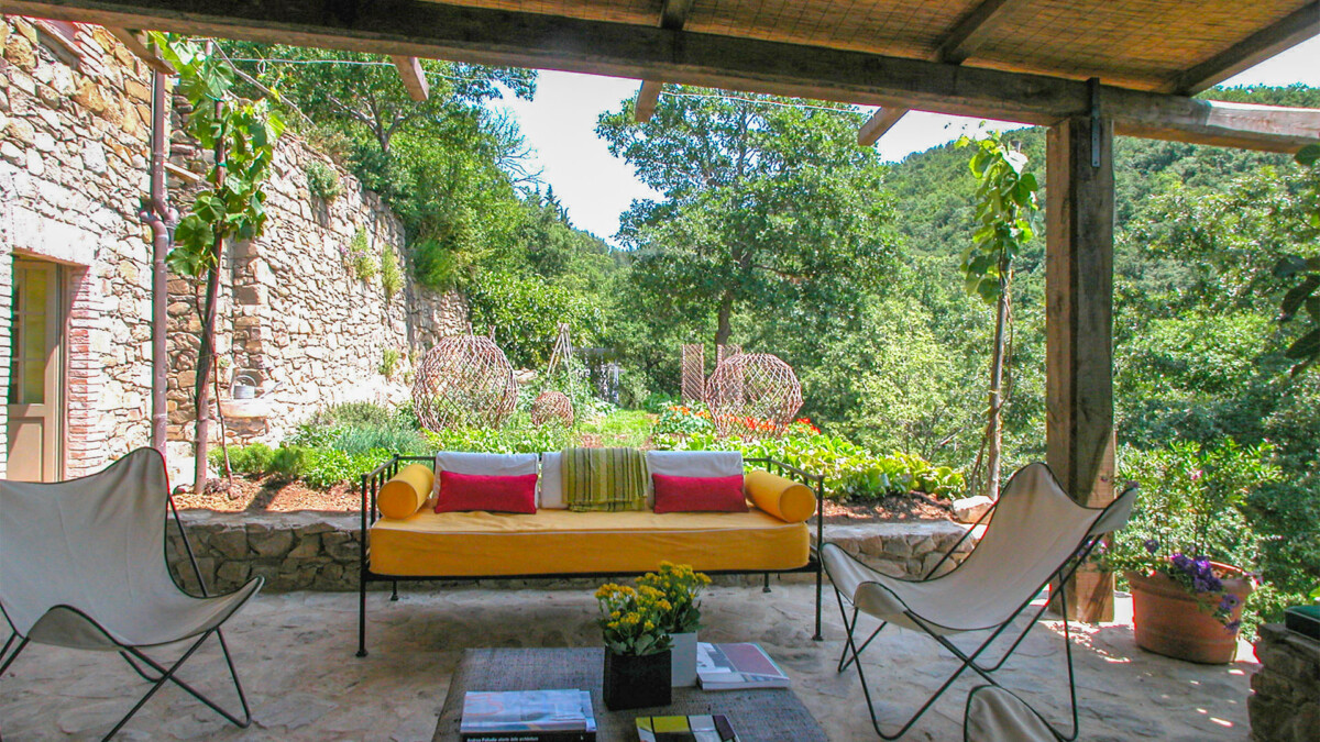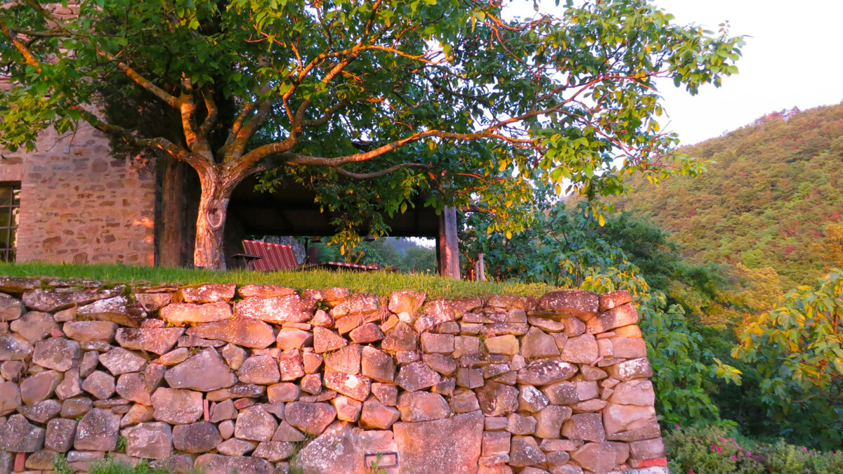 Terrasse pavée en pierre abritée très étendue face à la vallée pour les déjeuners et dîners en plein air jusqu’à 16 personnes assises. Barbecue intégré.