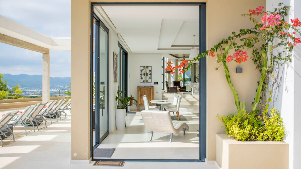 Accès direct à la terrasse panoramique principale, à la piscine et à la salle à manger extérieure.