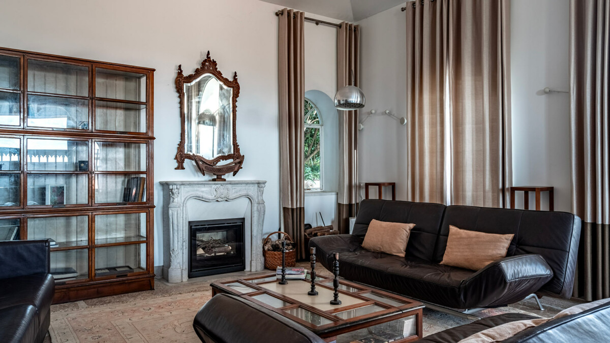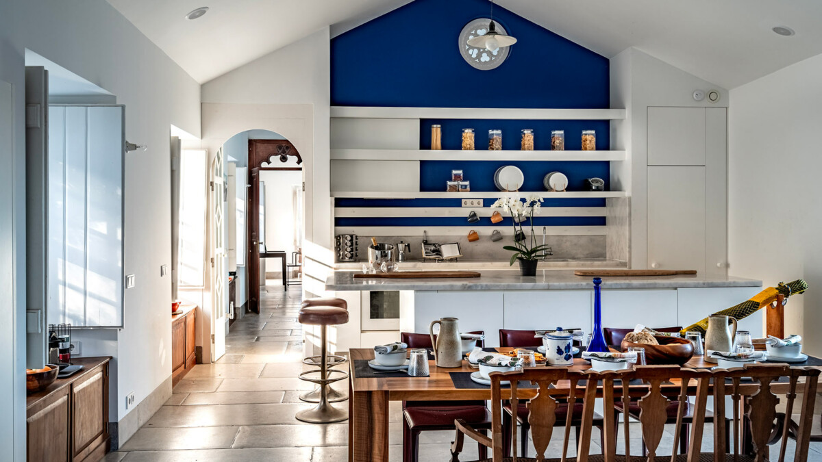 L’intérieur de la maison a été entièrement reconstruit pour offrir des espaces de vie lumineux et harmonieux. Les matériaux nobles tels que la pierre et le marbre confèrent une élégance discrète, tandis que le chauffage par le sol assure un confort optimal. Le salon spacieux, avec ses portes en bois sculpté et cadres de fenêtres en métal, invite à la détente. La salle à manger adjacente, idéale pour des repas conviviaux, est baignée de lumière naturelle grâce aux grandes baies vitrées.