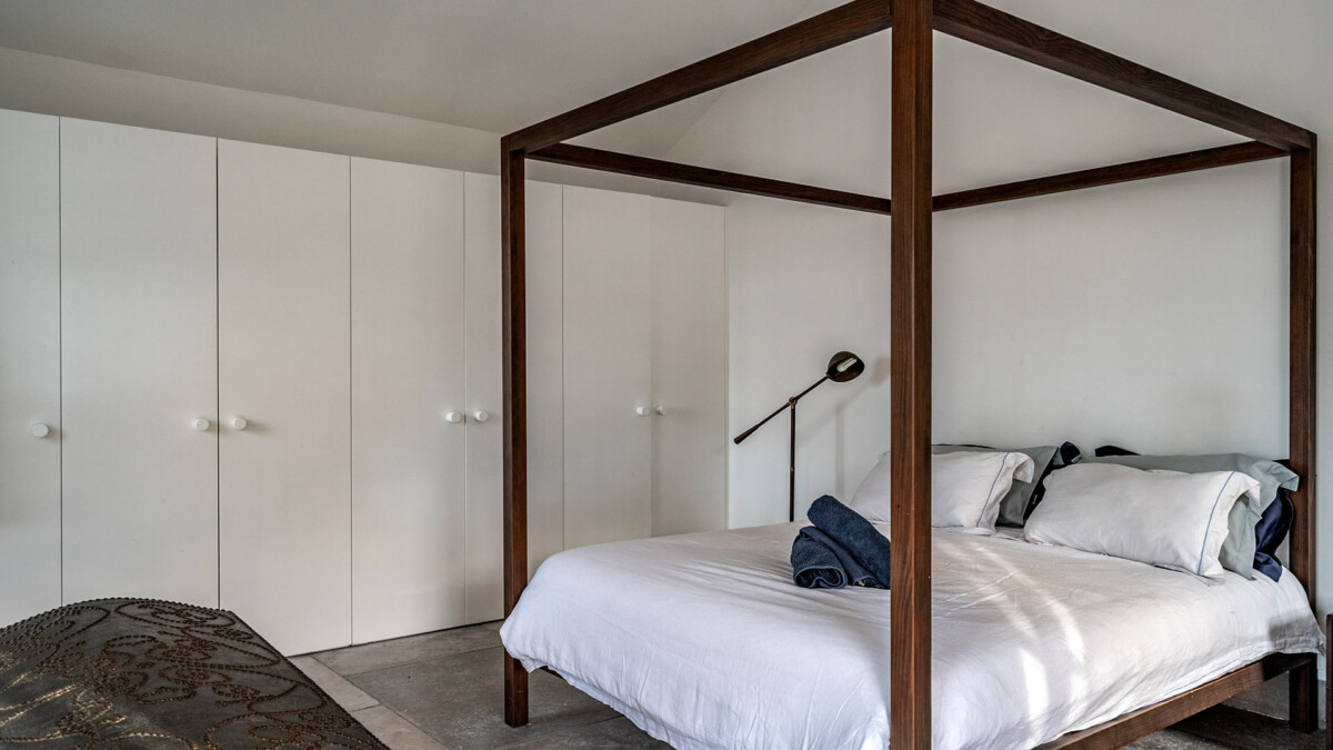 Chambre, Rez-de-chaussée. La chambre propose 1 lit double 160 cm. Salle de bain privée, partagée, avec baignoire. WC dans la salle de bain. La chambre inclut également : dressing.