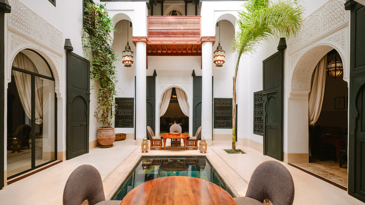 D’une surface au sol de 257 m2 et disposant d’un étage, le riad comprend au rez-de-chaussée: une entrée, un superbe patio avec bassin central, des toilettes invités, une cuisine exceptionnelle, deux salons et 2 premières chambres avec chacune une salle de bain.