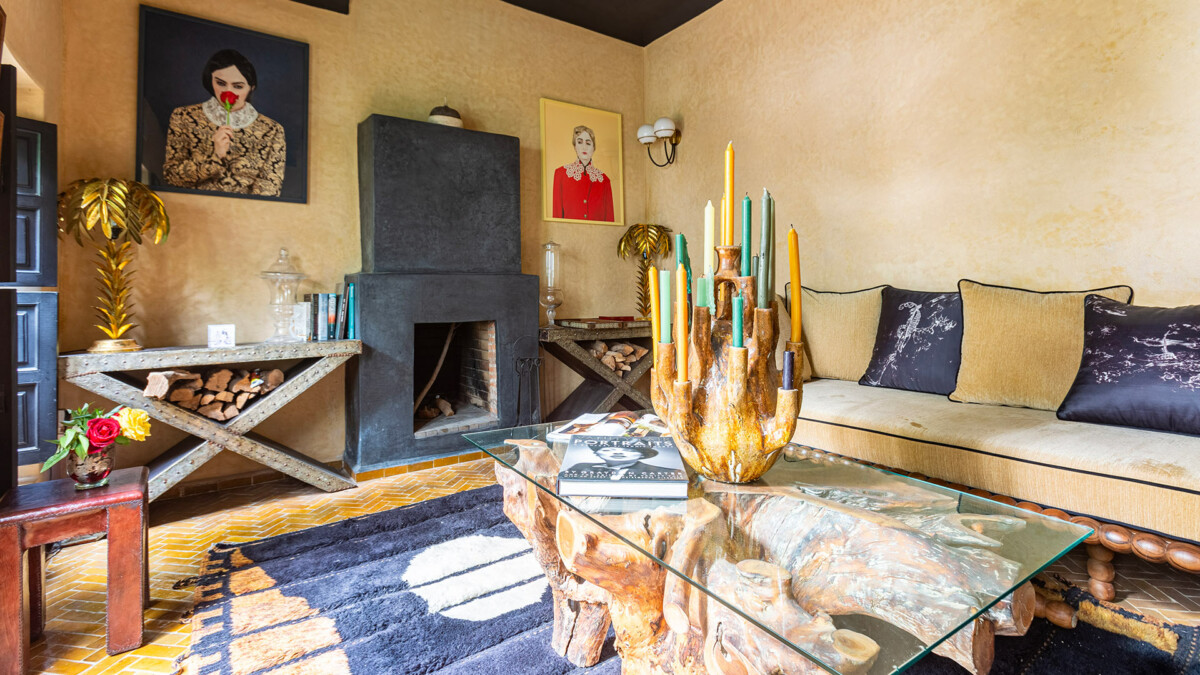 Le grand salon, une pièce maîtresse du riad, est parfait pour se détendre en toute sérénité. Confortablement meublé, il est agrémenté d’une cheminée pour les soirées fraîches, créant une ambiance chaleureuse et accueillante.