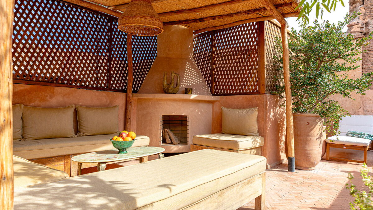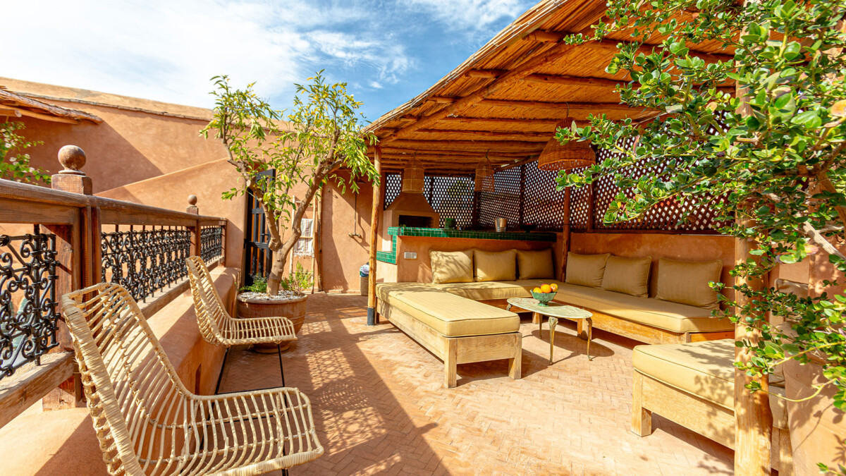 Le patio central, avec ses plantes luxuriantes et son petit bassin (1.5 x 2m – Profondeur : 0.5 à 1.2m) invite au repos absolu. La Bhou, espace extérieur aménagé pour se relaxer à l’ombre, complète cette atmosphère de sérénité. Sur le toit-terrasse, vous trouverez un vaste salon couvert, un bar d’été équipé d’une cuisine avec réfrigérateur, ainsi qu’un espace barbecue avec une cheminée extérieure. Ces installations sont parfaites pour des repas en plein air ou un moment de convivialité entre amis. Des transats sont également à votre disposition, parfaits pour profiter d’un bain de soleil, entourés d’orangers et d’arbres fruitiers.
