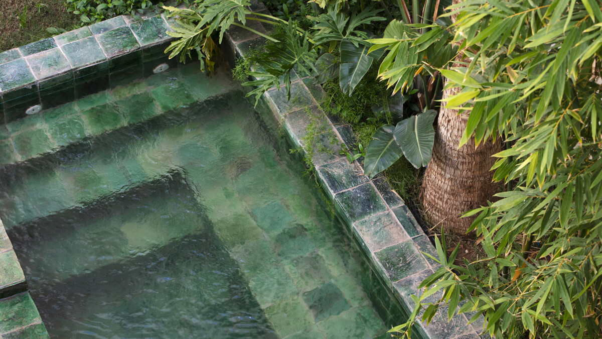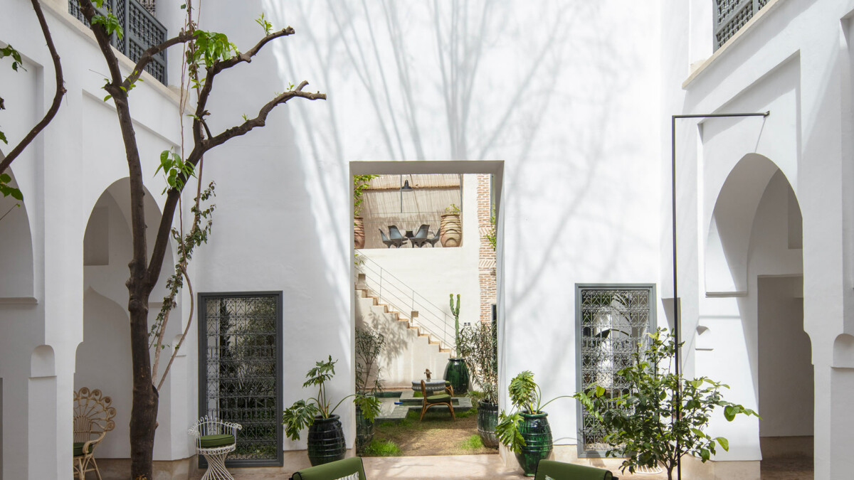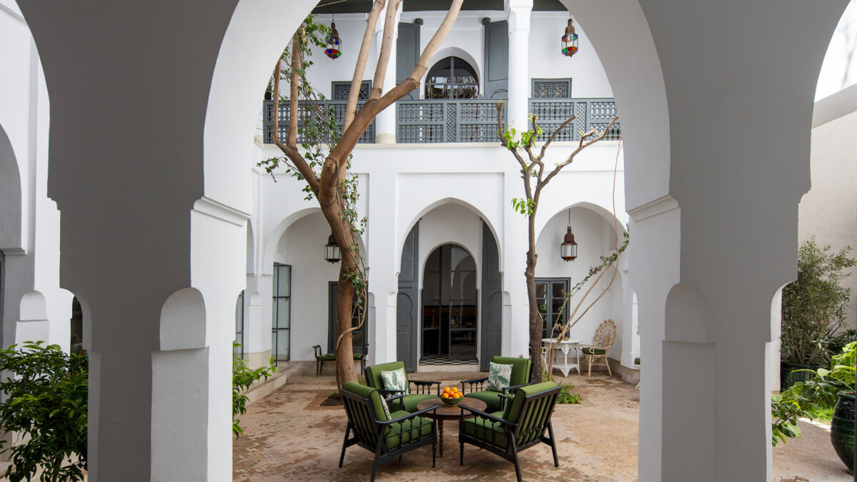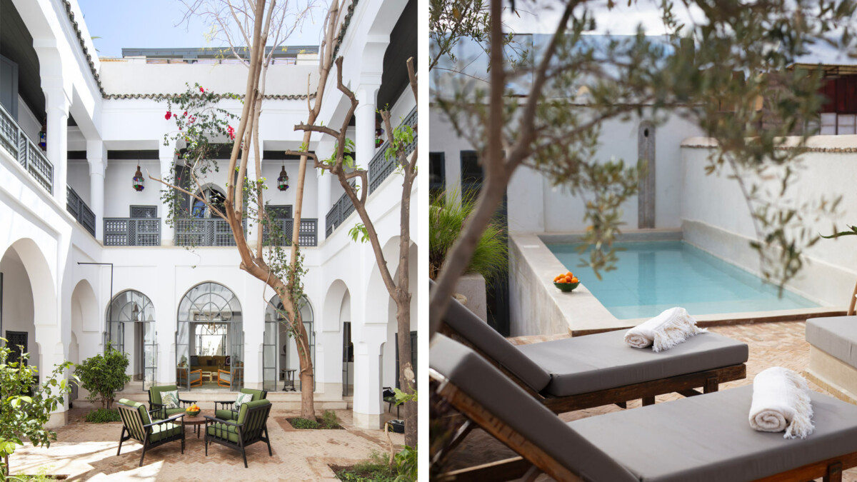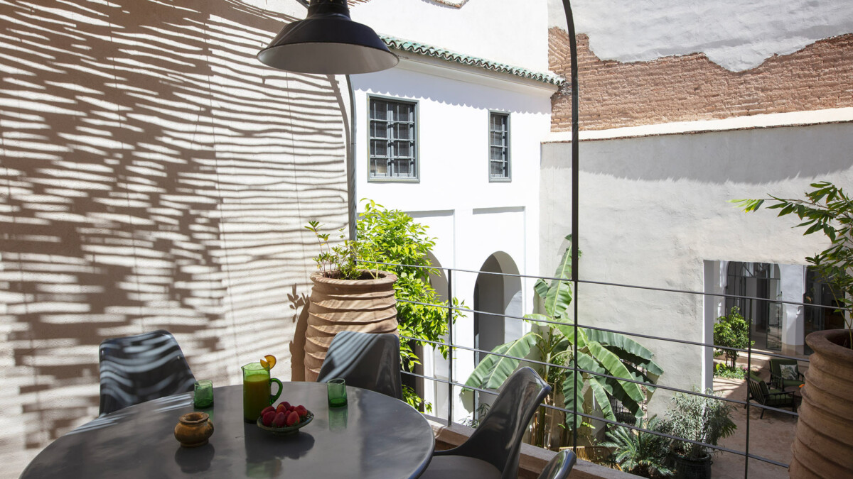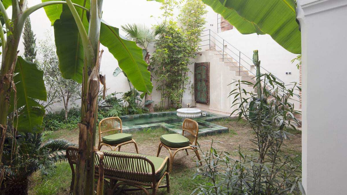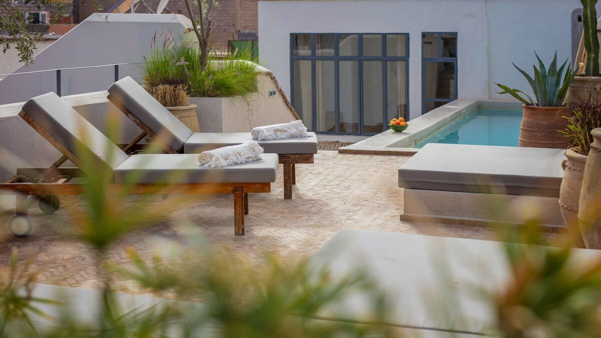 Au rez de chaussée, le patio est une véritable source de tranquilité, grâce à ses nombreux espaces pour se détendre et ses magnifiques arbres jacaranda, citronnier et mandarinier. La terrasse sur le toit dispose d’une piscine chauffée 8 x 3 mètres en tadelakt, d’une pergola abritant une salle à manger d’été, un salon extérieur et une douche extérieur.