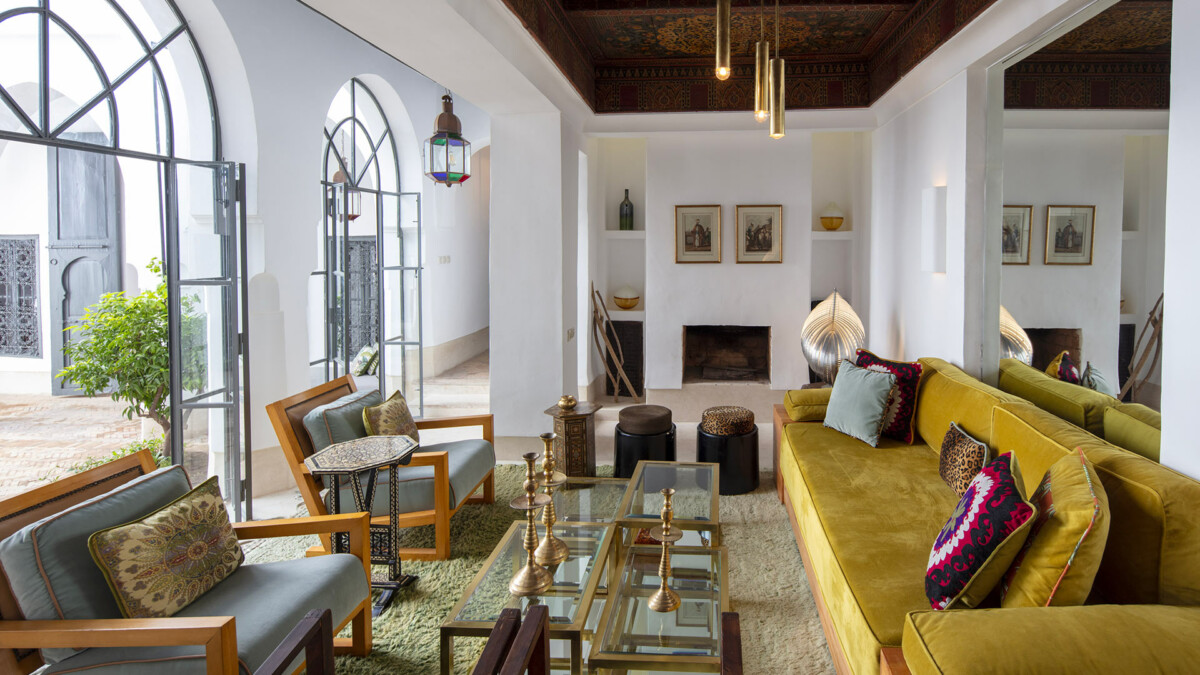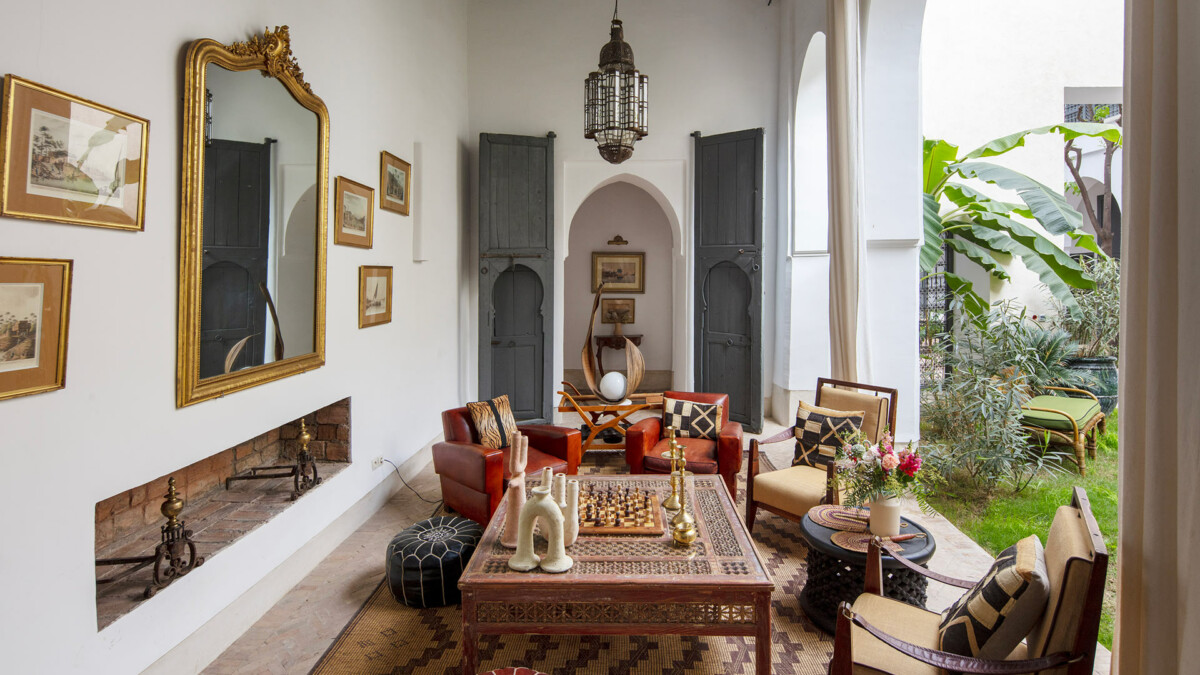 La propriété dispose d’un superbe salon d’été avec près de 5 mètres de hauteur sous plafond, natte mauritanienne et feu de cheminée ouvert sur le jardin et son bassin. La salle à manger d’hiver dispose un poêle prussien et le salon d’hiver, au plafond peint du 19ème siècle, a sa propre cheminée. Une salle de TV avec une bibliothèque, des dvd et une console de jeux est également à disposition. La cuisine est réservée à la cuisinière du riad, avec un libre accès aux boissons et café. L’ensemble de la propriété est climatisé et équipée d’un chauffage au sol ainsi qu’une connexion wifi performante.