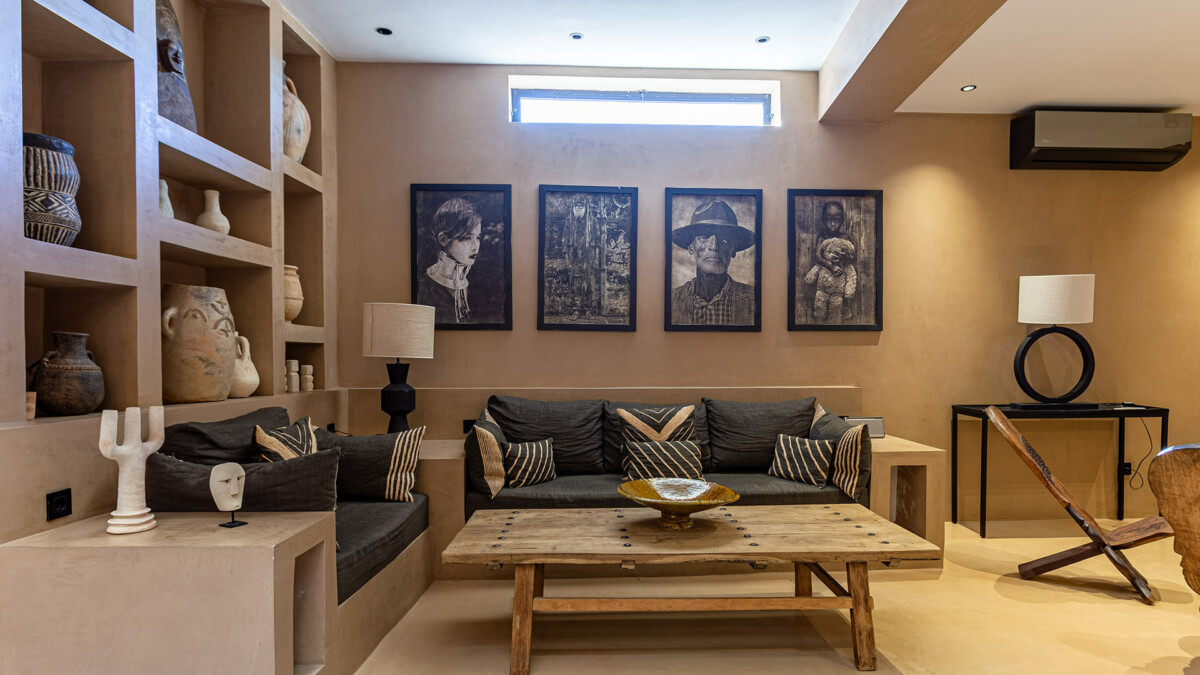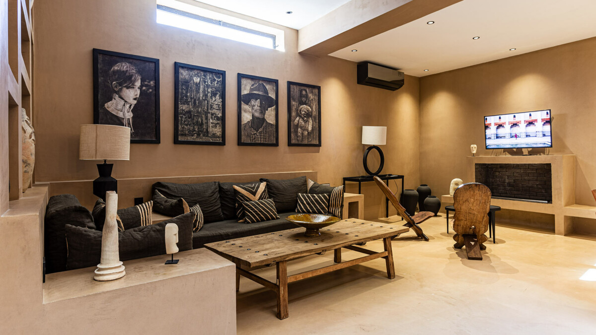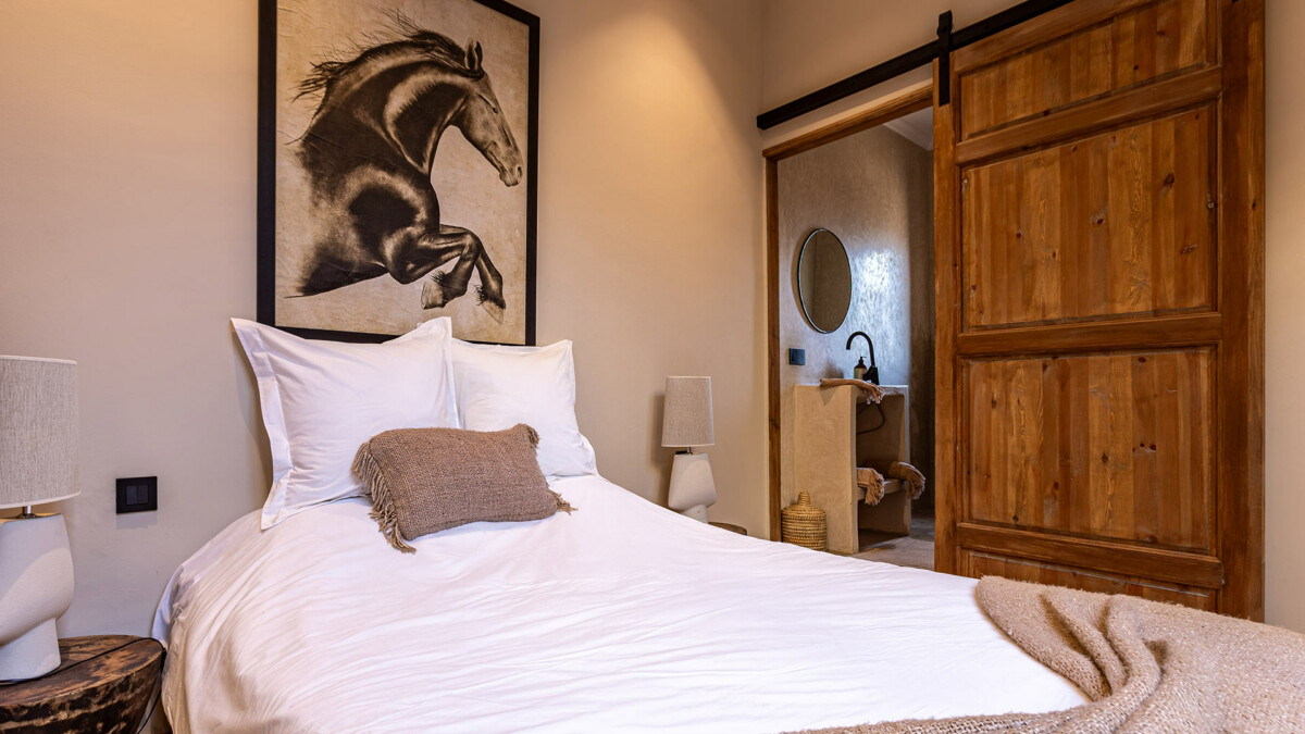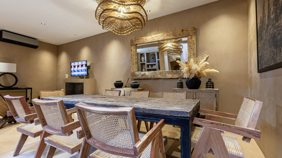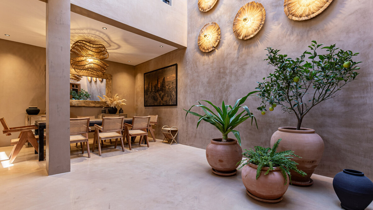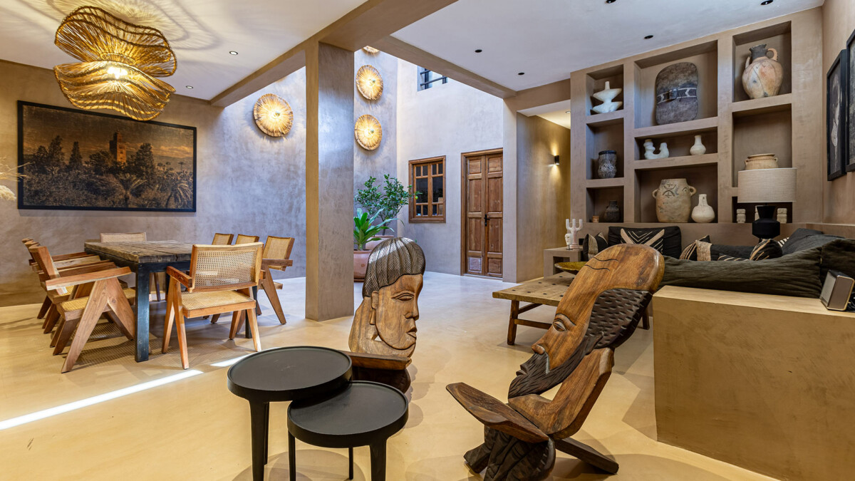 L’intérieur du riad enchante par son espace spacieux et lumineux, principalement grâce au patio central qui baigne les pièces de lumière naturelle. La salle à manger et le coin salon, agrémenté d’une cheminée à l’éthanol, d’une TV, et d’une connexion Wi-Fi, sont parfaits pour des moments conviviaux et des soirées détendues. Vous avez accès à une cuisine entièrement équipée pour préparer de délicieux repas en toute simplicité. La décoration soigneusement choisie apporte une touche d’élégance et de modernité au charme traditionnel du riad.
