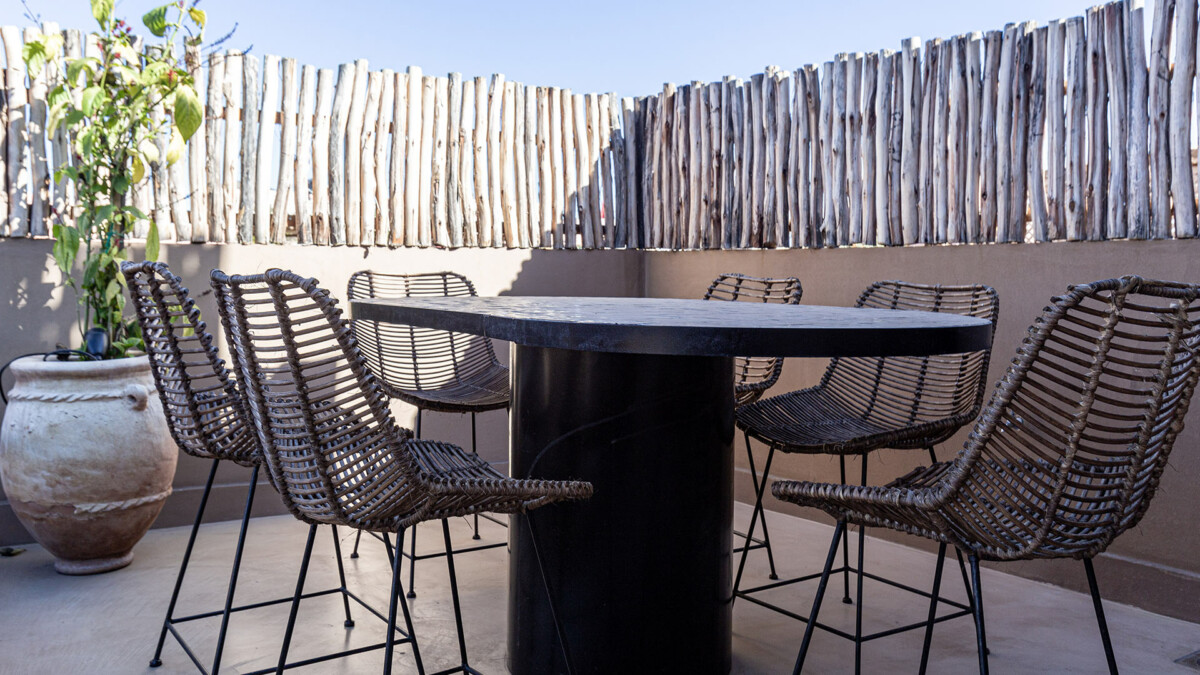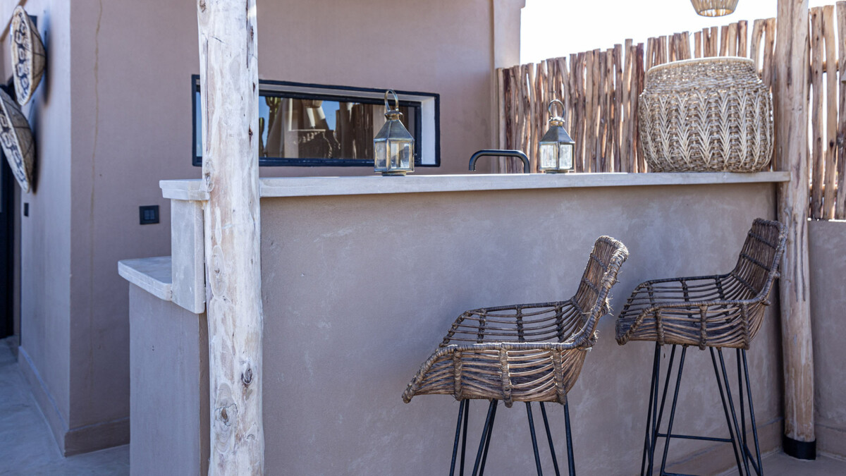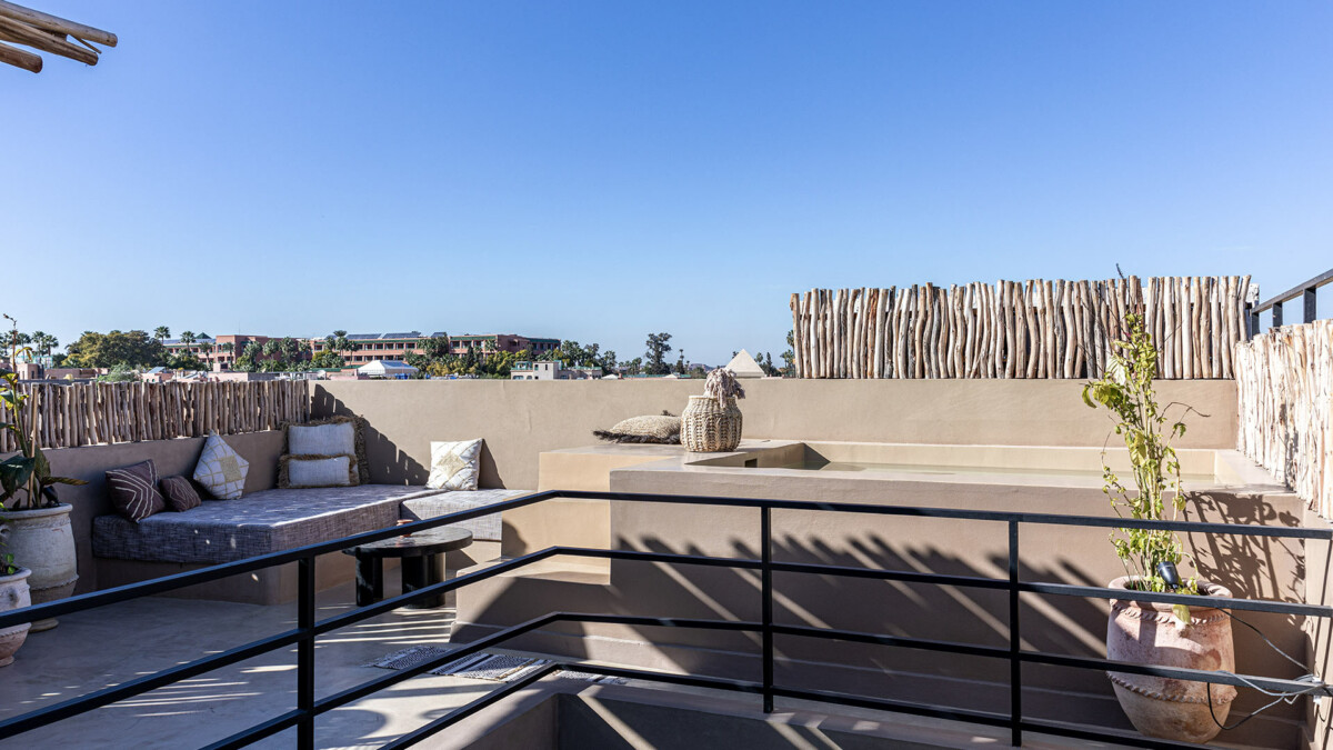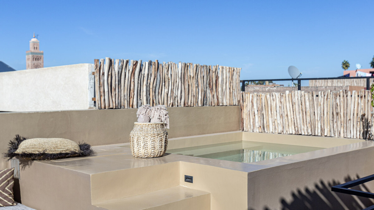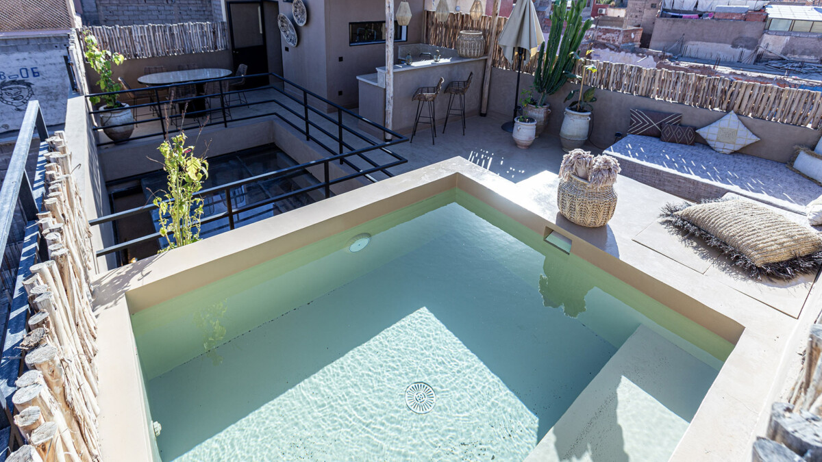 Le roof top du riad est un lieu d’exception, avec une très belle vue sur Marrakech. Vous pourrez profiter de la petite piscine (3 x 2m, Profondeur : 0,9m) pour vous rafraîchir lors des journées ensoleillées, ou vous détendre au bar avec une boisson à la main. Le frigo et la plancha, à portée de main, permettent d’organiser facilement des repas en plein air.