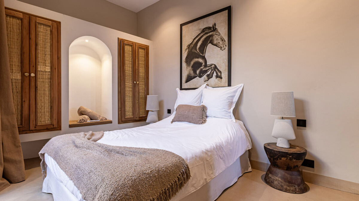 Chambre, 1er étage. La chambre propose 1 lit double 160 cm. Salle de bain privée, avec douche. WC dans la salle de bain. La chambre inclut également : climatisation, dressing.