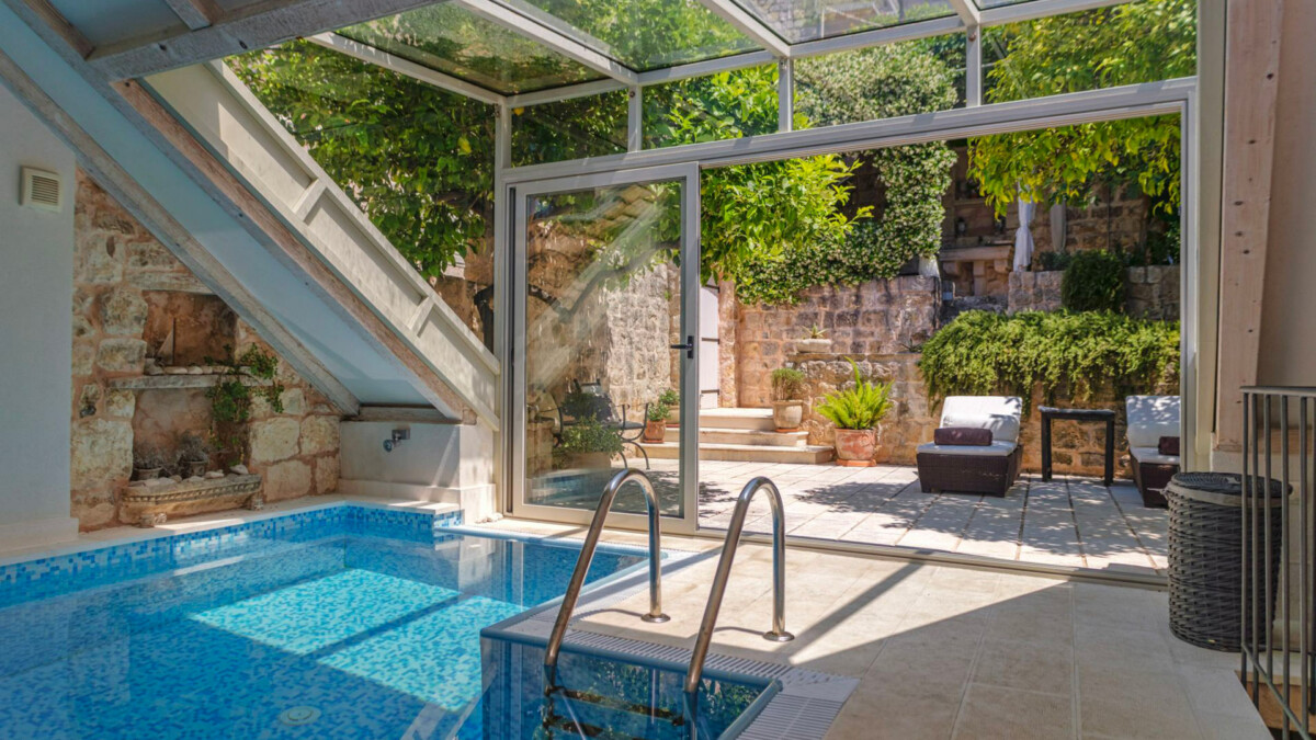 Elle est reliée au palais baroque au rez de chaussée. Le premier étage abrite une piscine couverte (env. 25 m²) avec des parois mobiles qui peuvent être ouvertes, transformant ainsi la piscine intérieure en une piscine extérieure avec un accès direct au jardin.