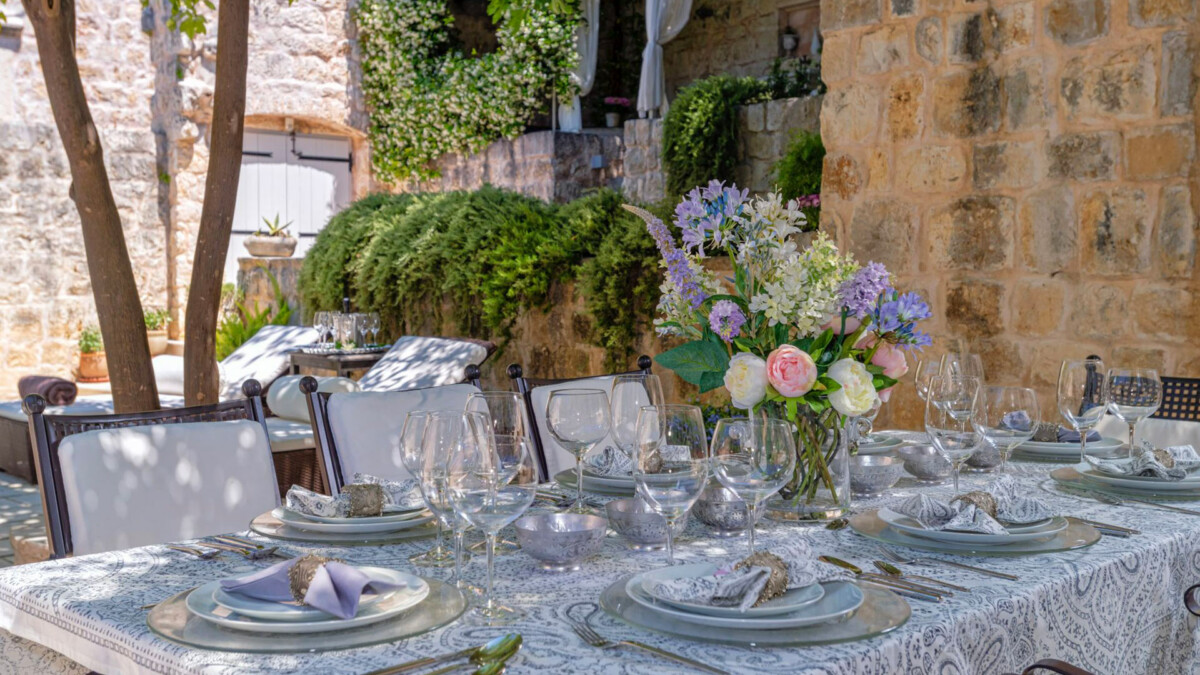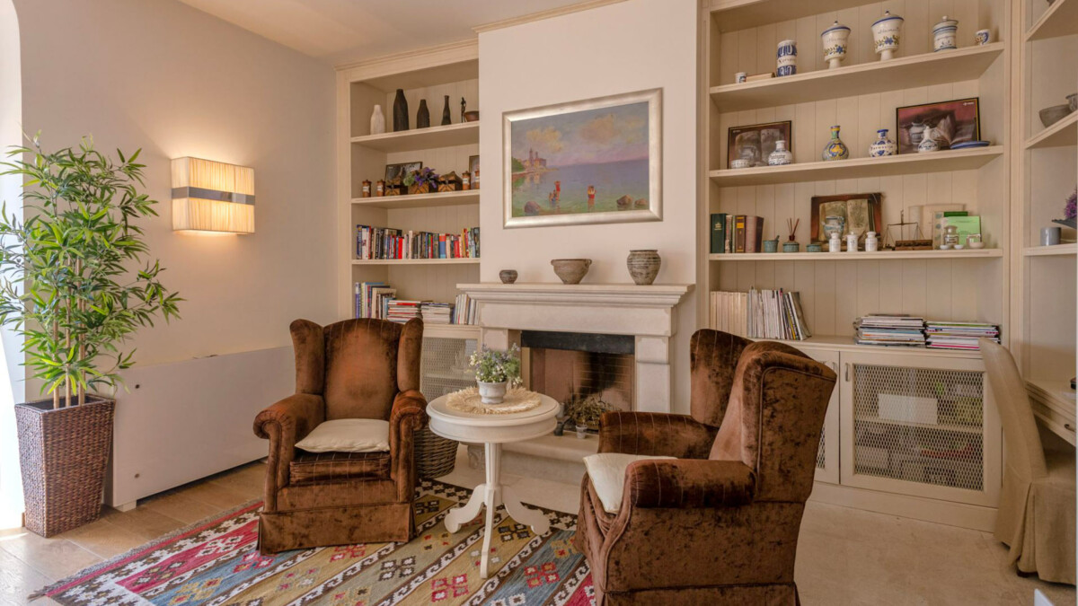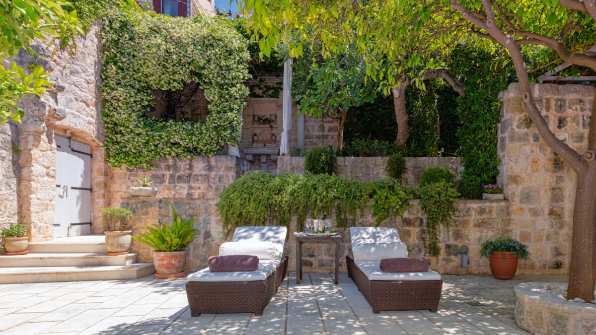 Le jardin de 200 m² est entouré par un mur de pierre de plus de deux mètres de haut. Il abrite une végétation essentiellement méditerranéenne (citrons, oranges, figues, lavande …). Il y a aussi une table pouvant accueillir 10 personnes ainsi que des meubles de jardin avec chaises longues près de la piscine. Un couloir dessert trois chambres doubles (50 m², 36 m² et 25 m²) au premier étage – chacune avec sa propre salle de bain.