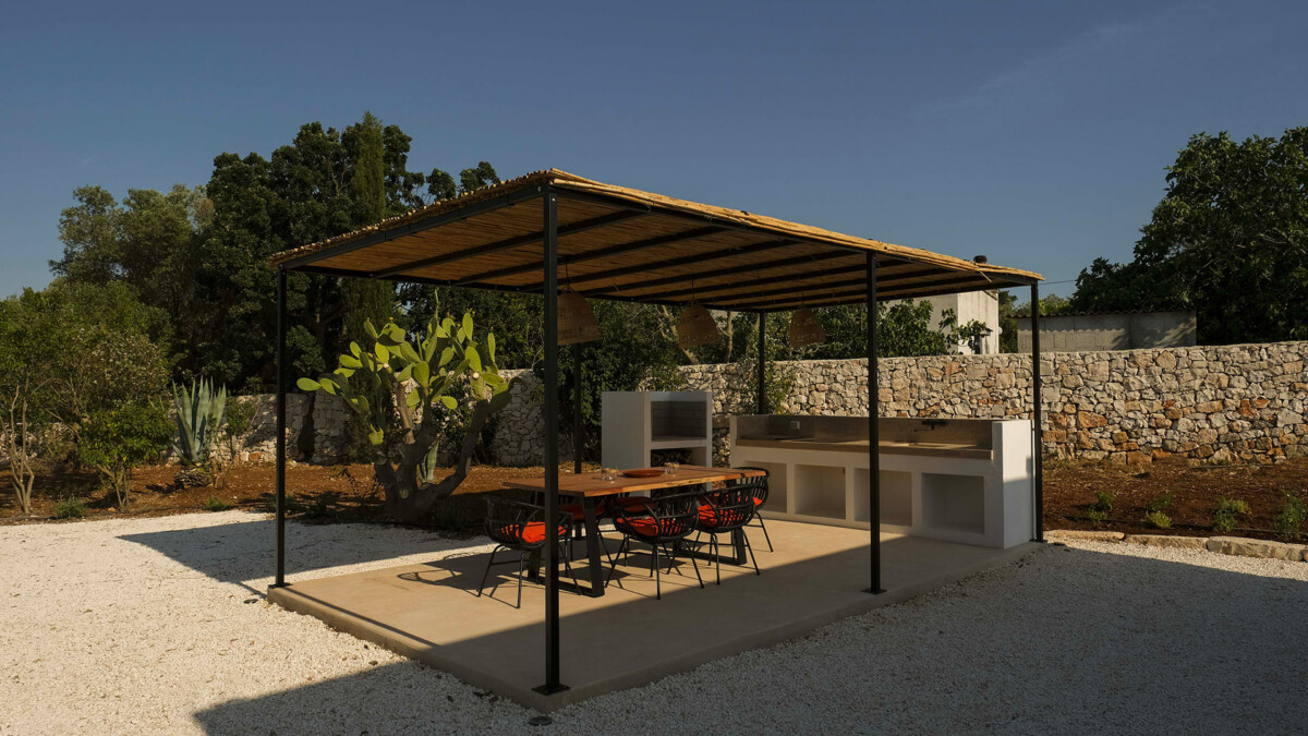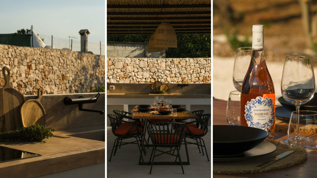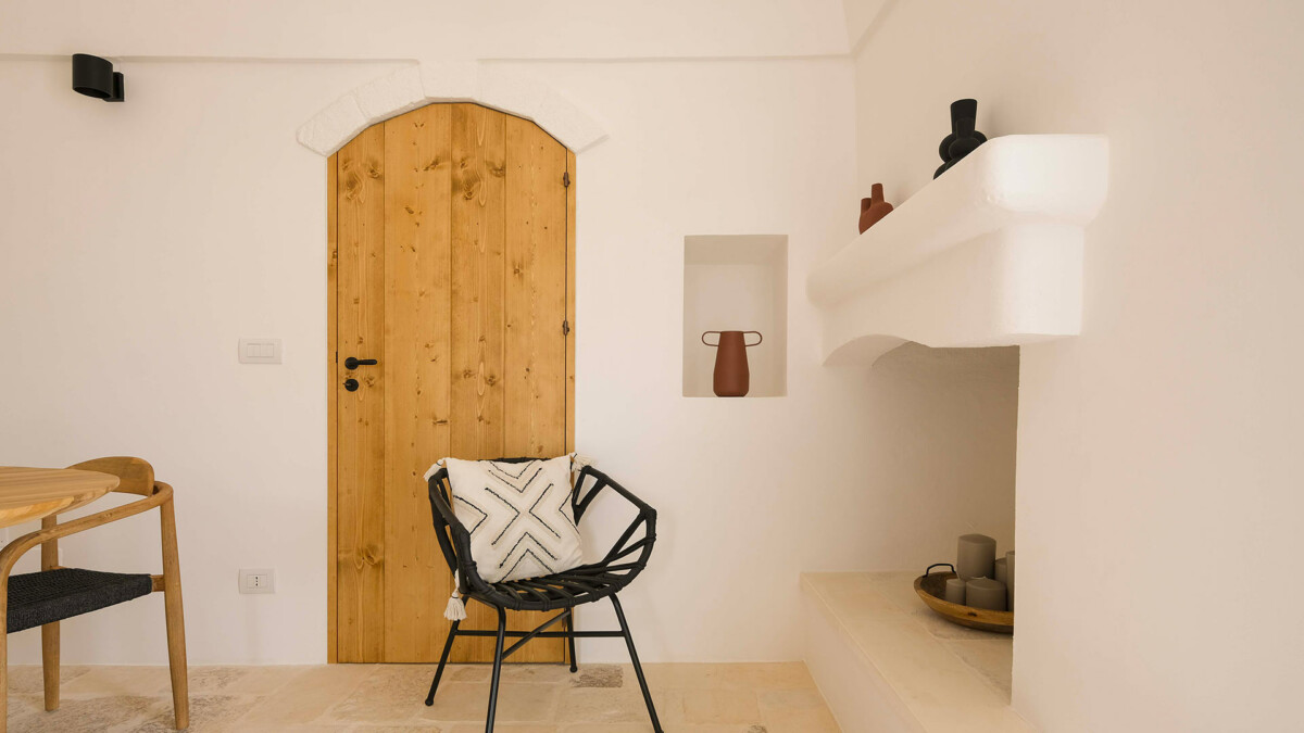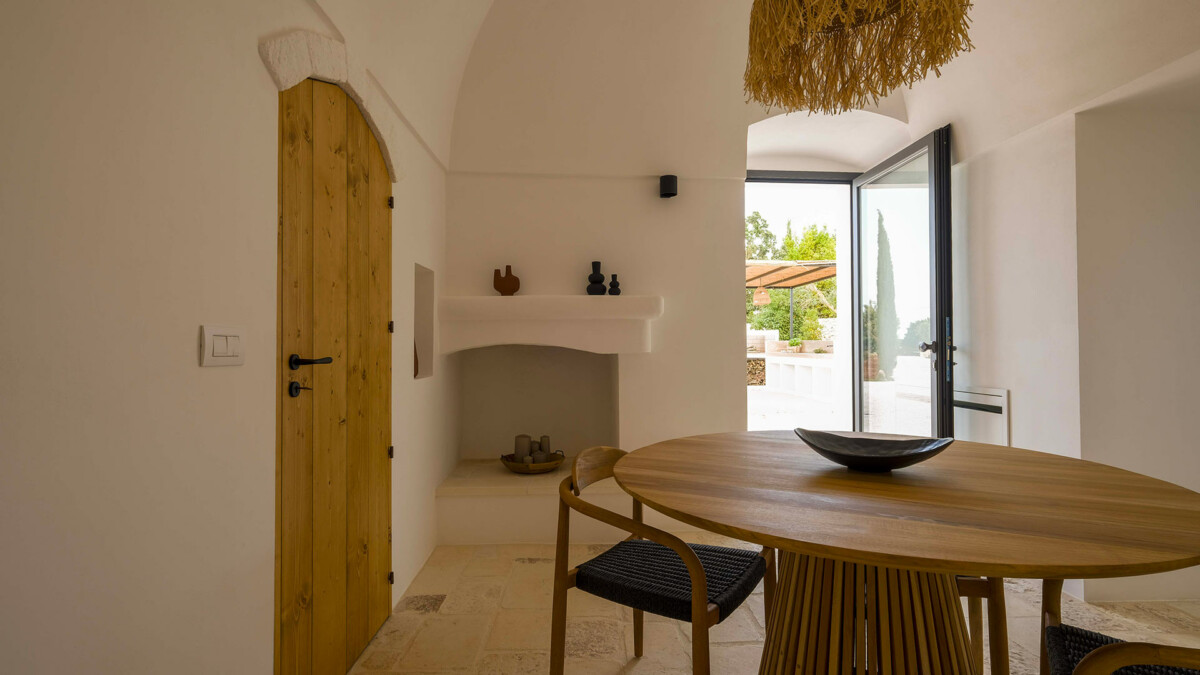 L’intérieur est un véritable hommage à l’architecture apulienne et au design italien contemporain. En entrant, vous serez accueilli par une ambiance chaleureuse et intime, caractérisée par des tons doux et profonds. La maison comprend un salon spacieux avec des canapés confortables et des éléments de décoration traditionnels mêlés à du mobilier design italien. La salle à manger, pouvant accueillir jusqu’à cinq personnes, est un espace convivial parfait pour des repas en famille ou entre amis. La cuisine, entièrement équipée, est un joyau de design alliant modernité et matériaux traditionnels, offrant tous les appareils nécessaires pour concocter des repas délicieux.